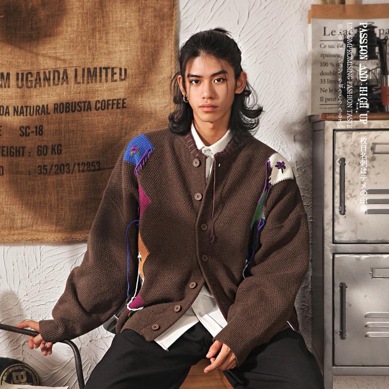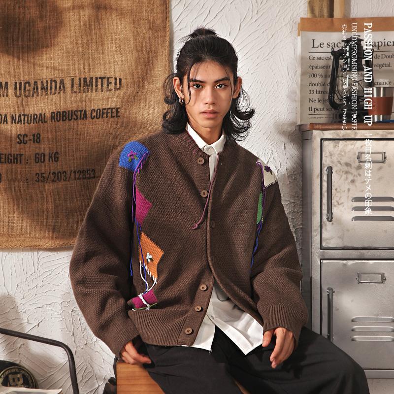 雅痞制噪日系复古开衫毛衣男秋冬季菱格拼色加厚保暖针织衫外套男