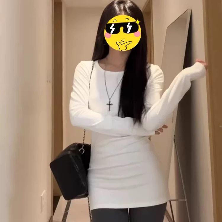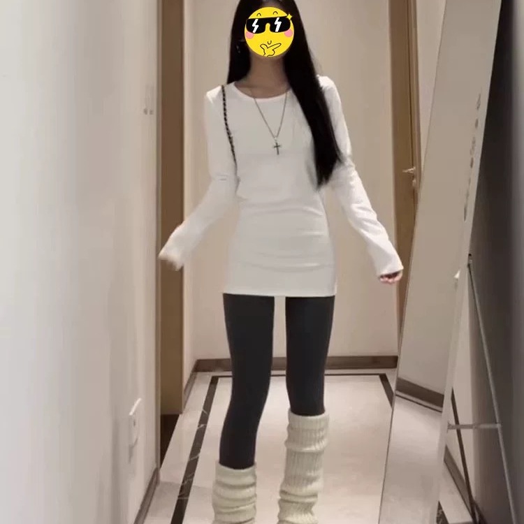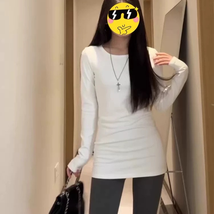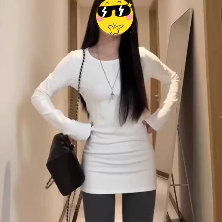 纯棉白色正肩长袖T恤女秋冬内搭中长款打底衫遮屁股外穿修身上衣
