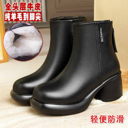 高跟靴子短靴女款冬季加绒保暖妈妈棉鞋中年女士皮鞋真皮羊毛棉靴