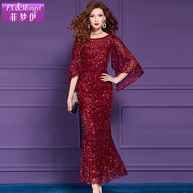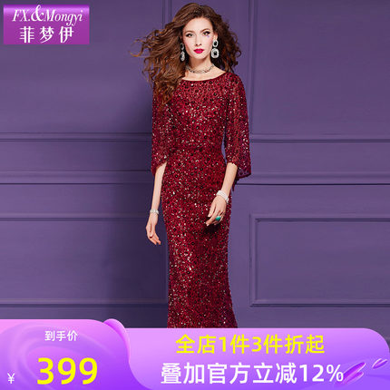菲梦伊亮片红色连衣裙女秋季新款轻熟高级质感气质优雅长裙晚礼服