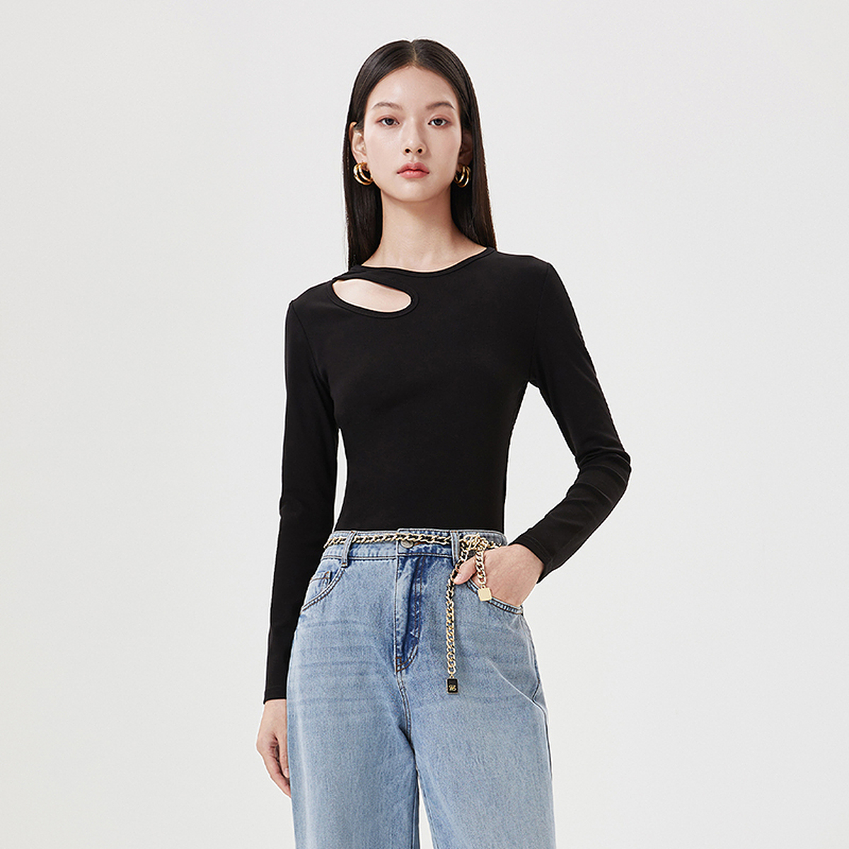 FIVE PLUS长袖T恤女通勤上衣修身镂空设计感打底衫