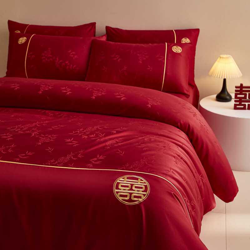 中式喜字结婚四件套大红色陪嫁床单被套纯棉婚庆床上用品婚房喜被