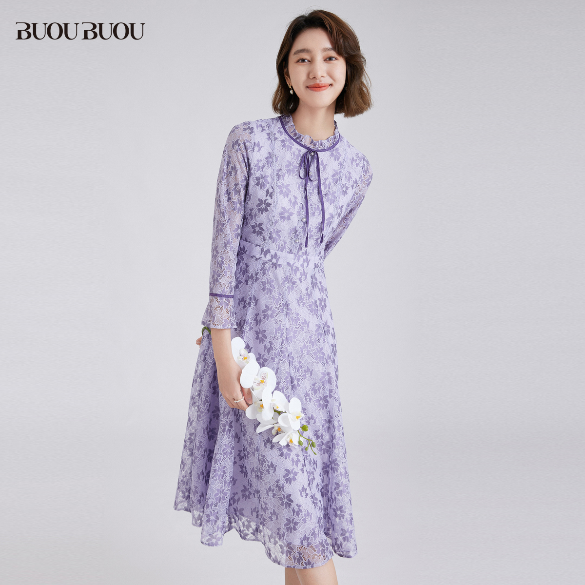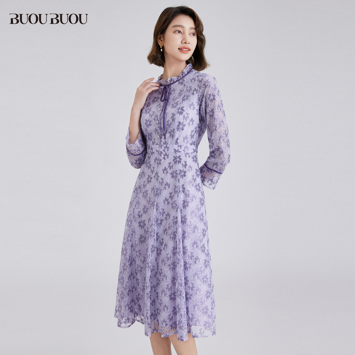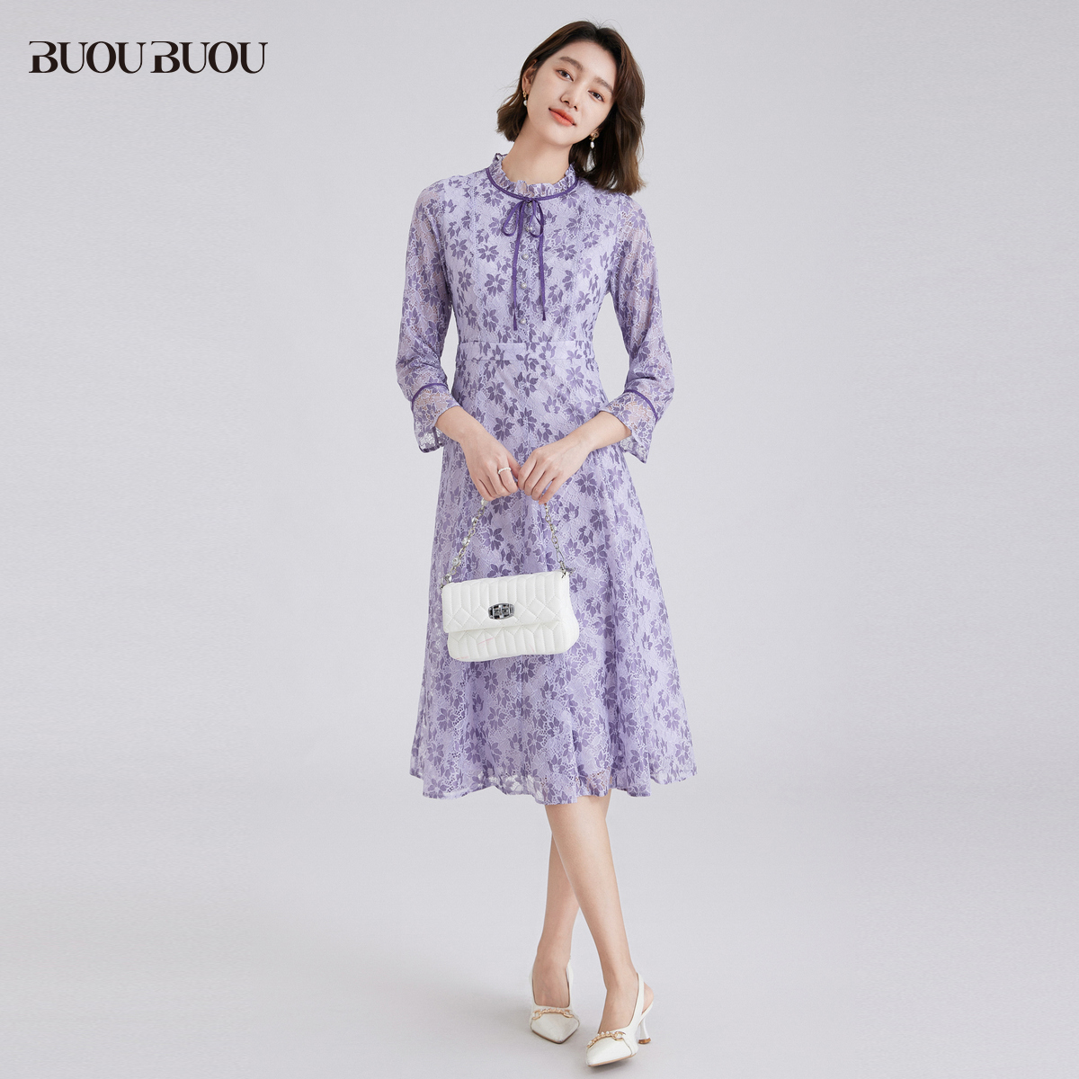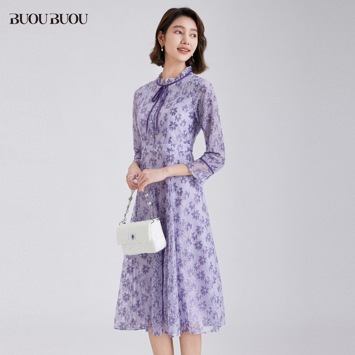 【关注领券】Buou Buou法式优雅圆领刺绣蕾丝高腰连衣裙女WJ4G012