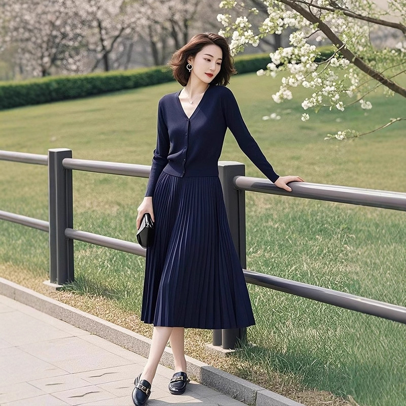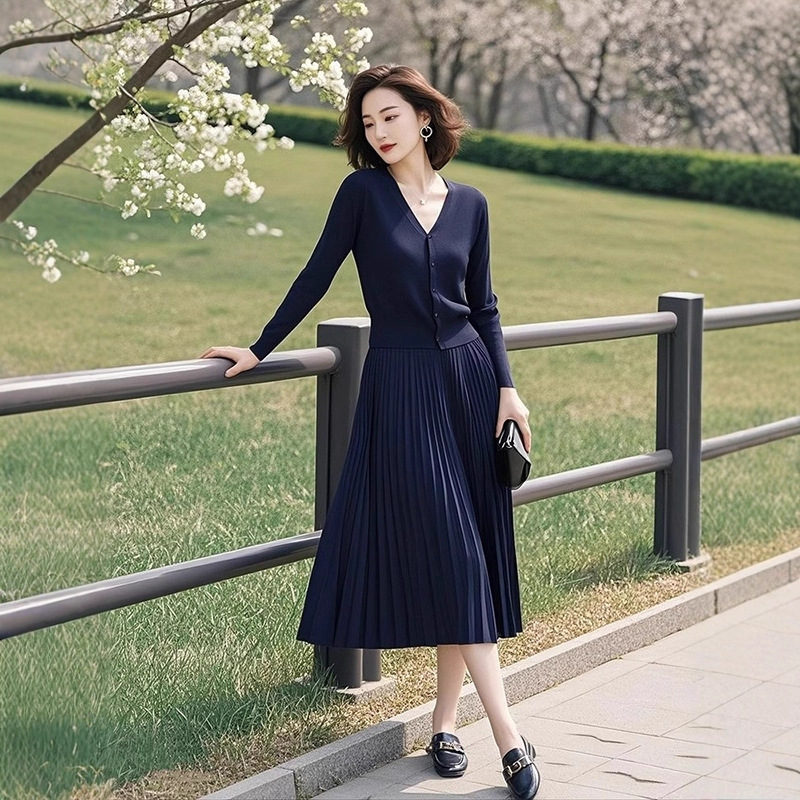 今年流行特惠深蓝色针织套装女装2025秋季新款韩版开衫上衣百褶