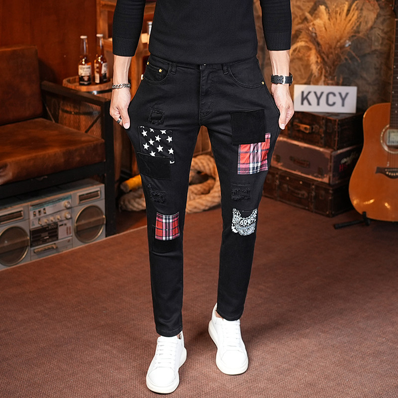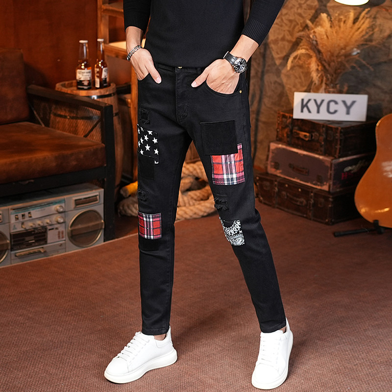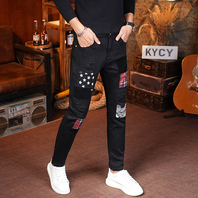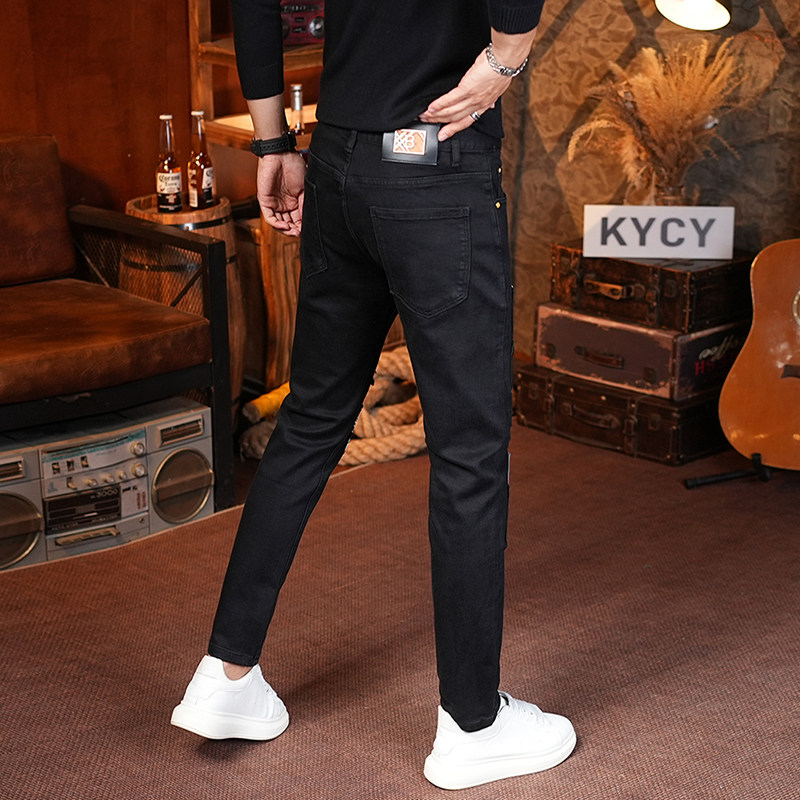 高端破洞牛仔裤男秋季新款黑色修身小脚弹力拼接男士潮流弹力长裤