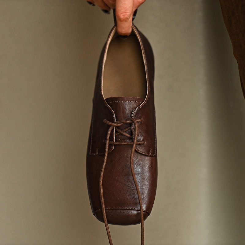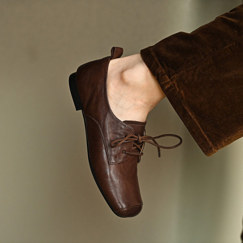 真皮方头单鞋女2025新款复古英伦风小皮鞋系带平底鞋百搭乐福鞋