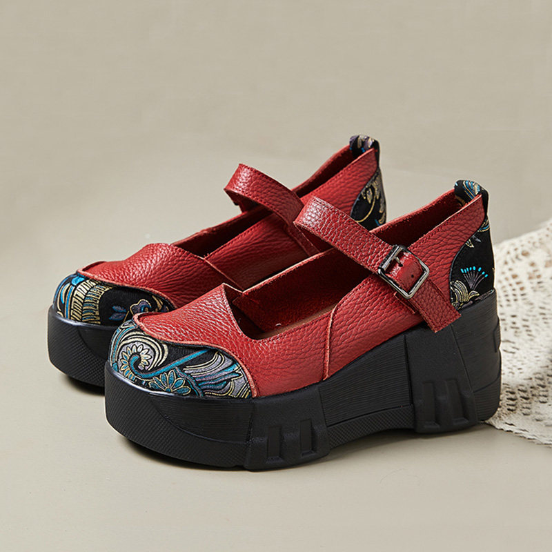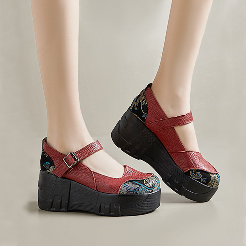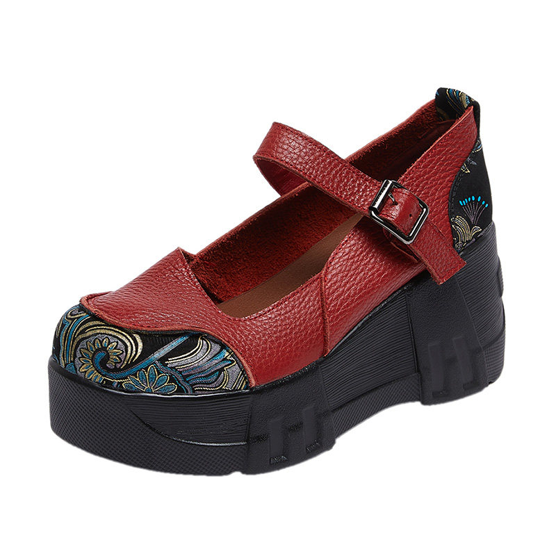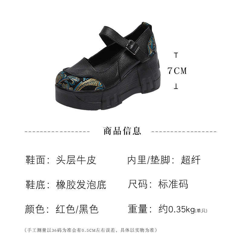 民族风女鞋花朵真皮单鞋坡跟防水台厚底皮鞋女式浅口圆头春季新款