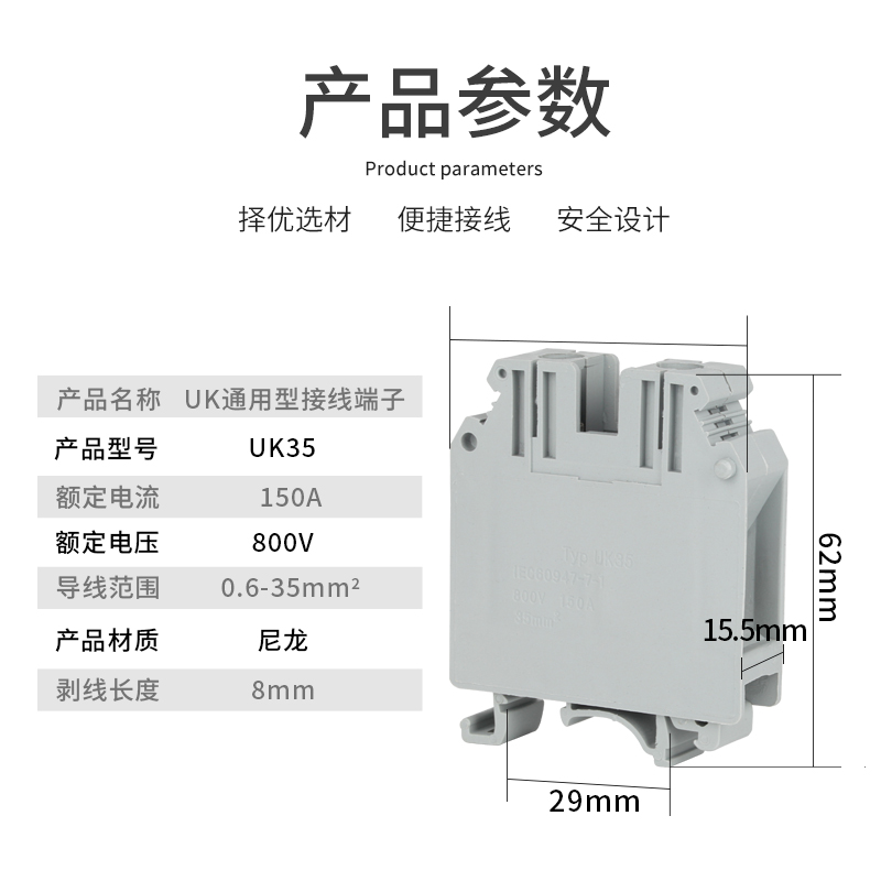 导轨式UK35接线端子UK-35连接器排35mm平方压线组合式接插件10只