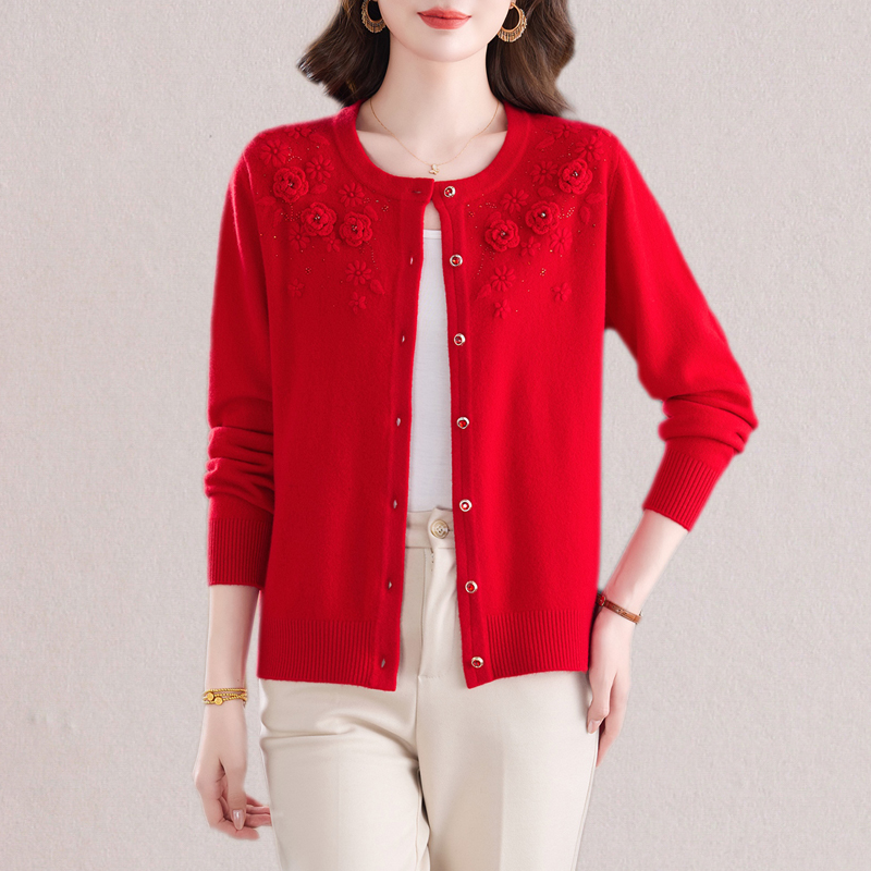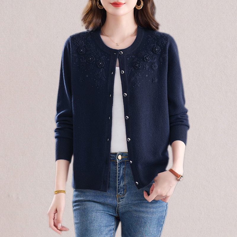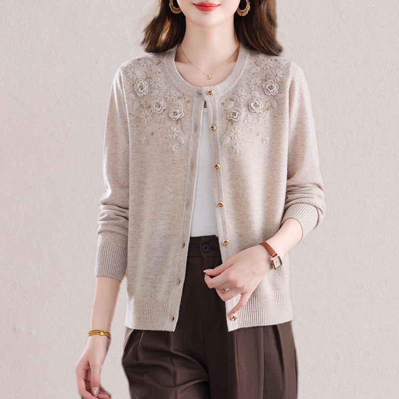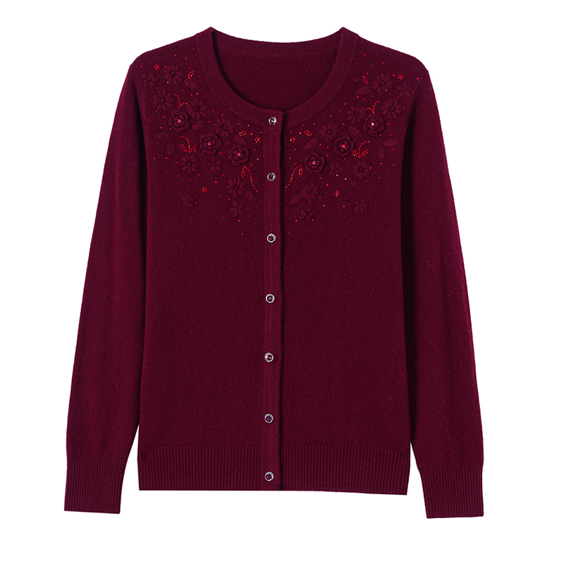 鄂尔多斯市100%纯羊毛针织开衫女圆领绣花毛衣外套宽松显瘦春秋装