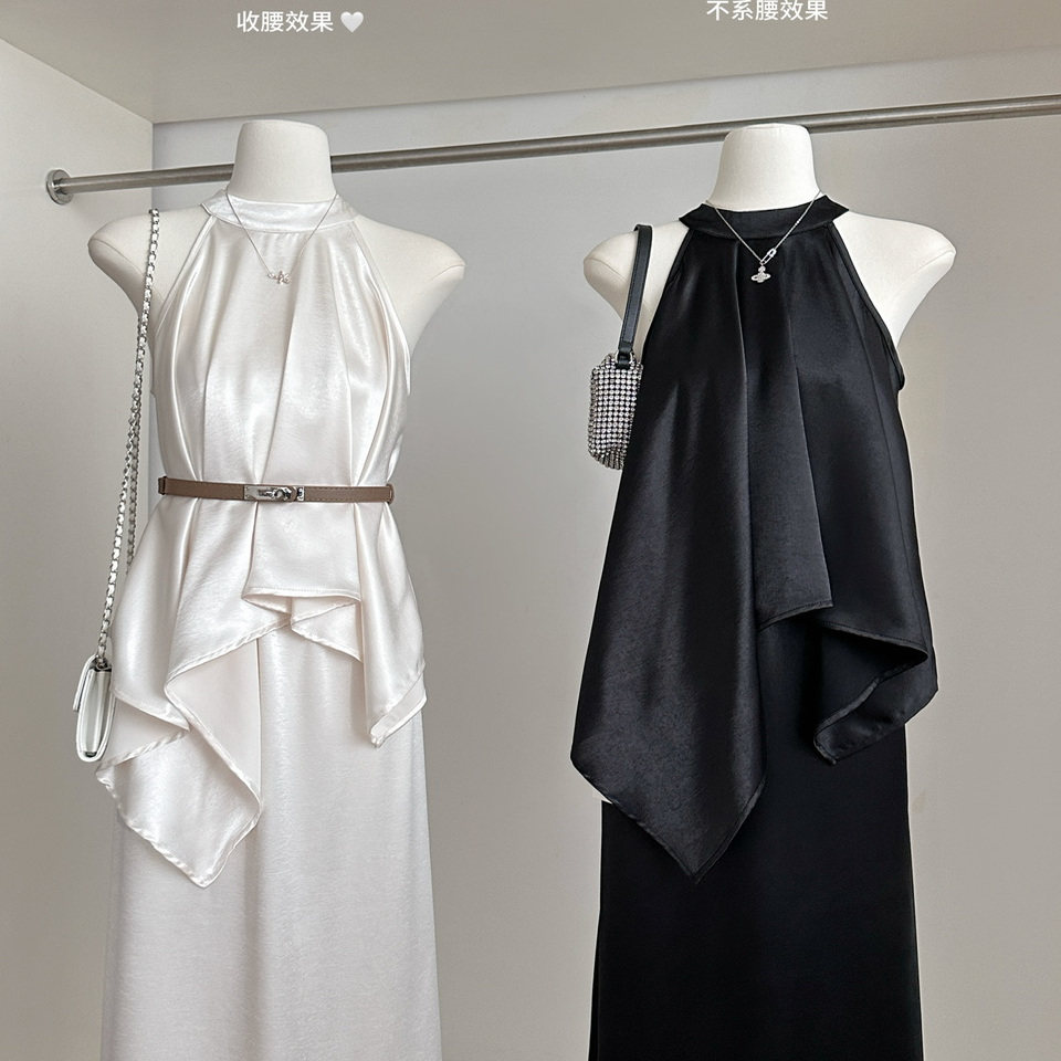 气质高级感无袖背心挂脖衬衫上衣+缎面半身裙巨好看的夏装一整套