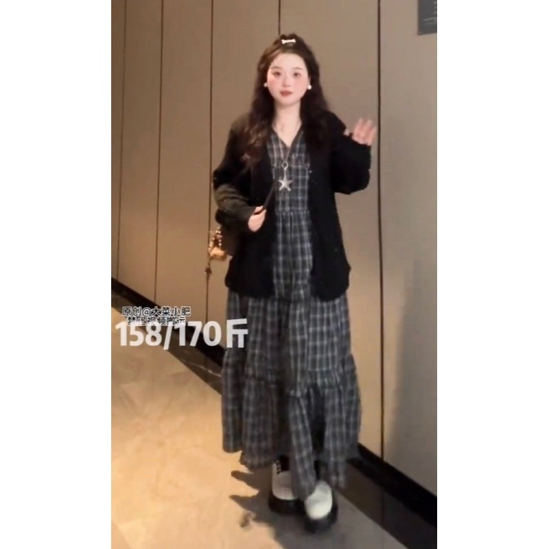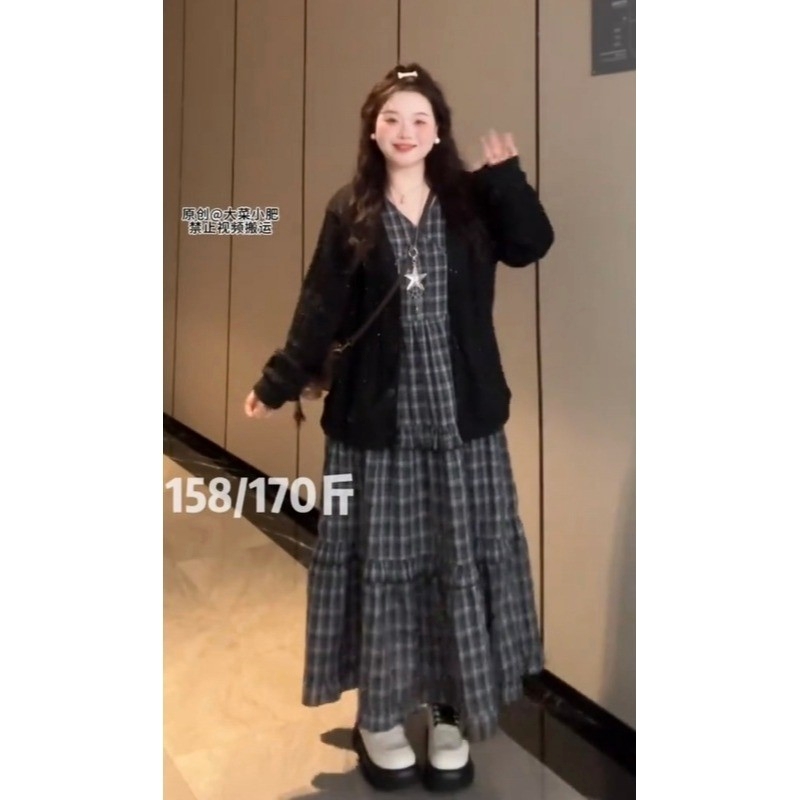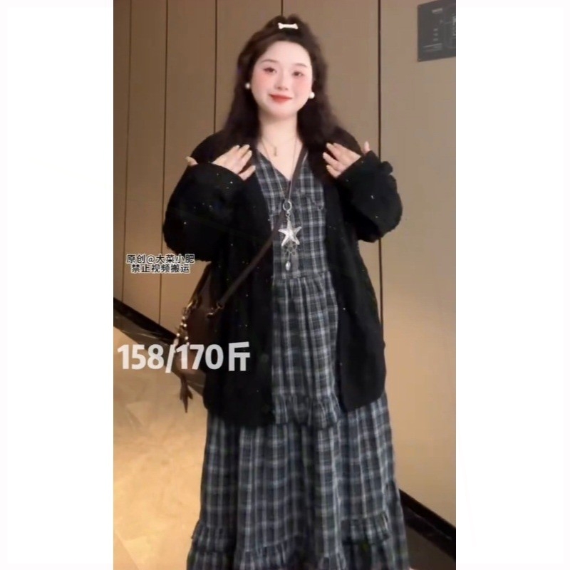 】大码宽松开衫外套显瘦格子连衣裙套装工作室原创【大菜小肥打版