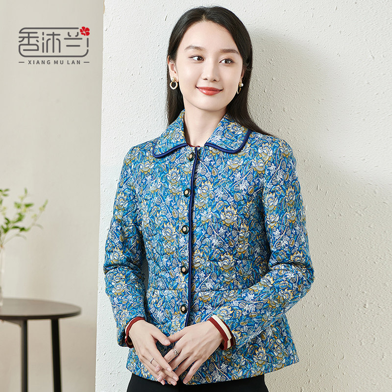 香沐兰2025秋冬蓝色印花棉衣外套中老年妈妈装大码保暖棉服上衣女