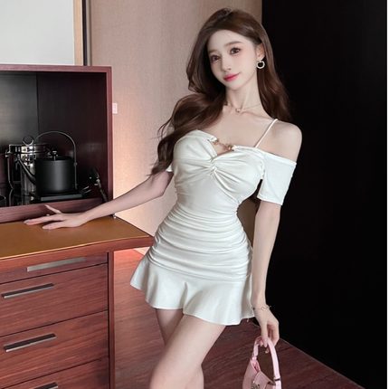 气质纯欲甜辣妹性感一字肩露肩袖抹胸吊带连衣裙女修身荷叶边短裙