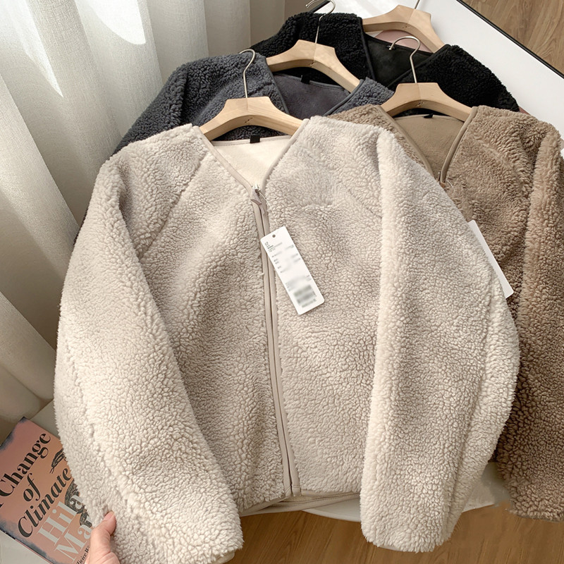 大厂日单~2025秋冬新款柔软羊羔绒V领拉链保暖摇粒绒短外套女