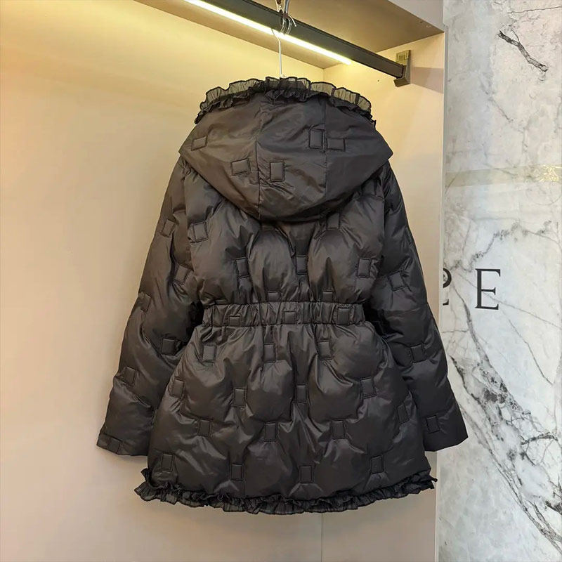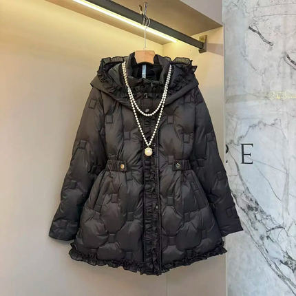 加肥连帽荷叶边松紧收腰长袖棉服胖妹妹冬季款黑色显瘦中长款外套