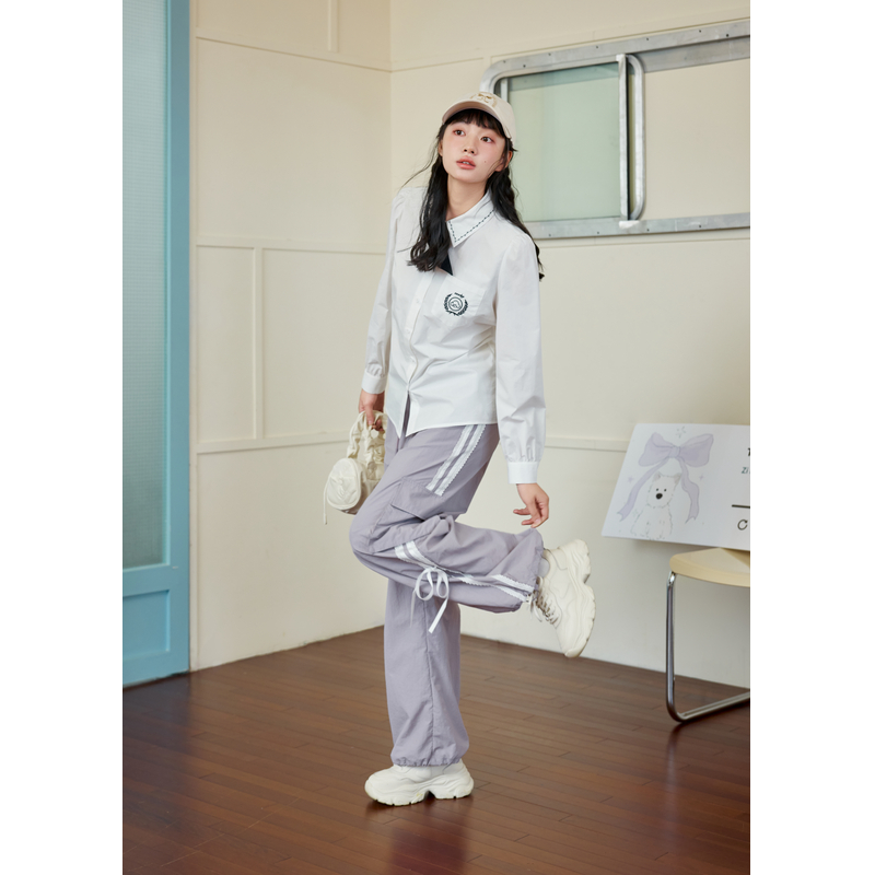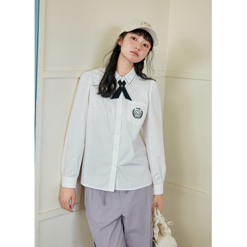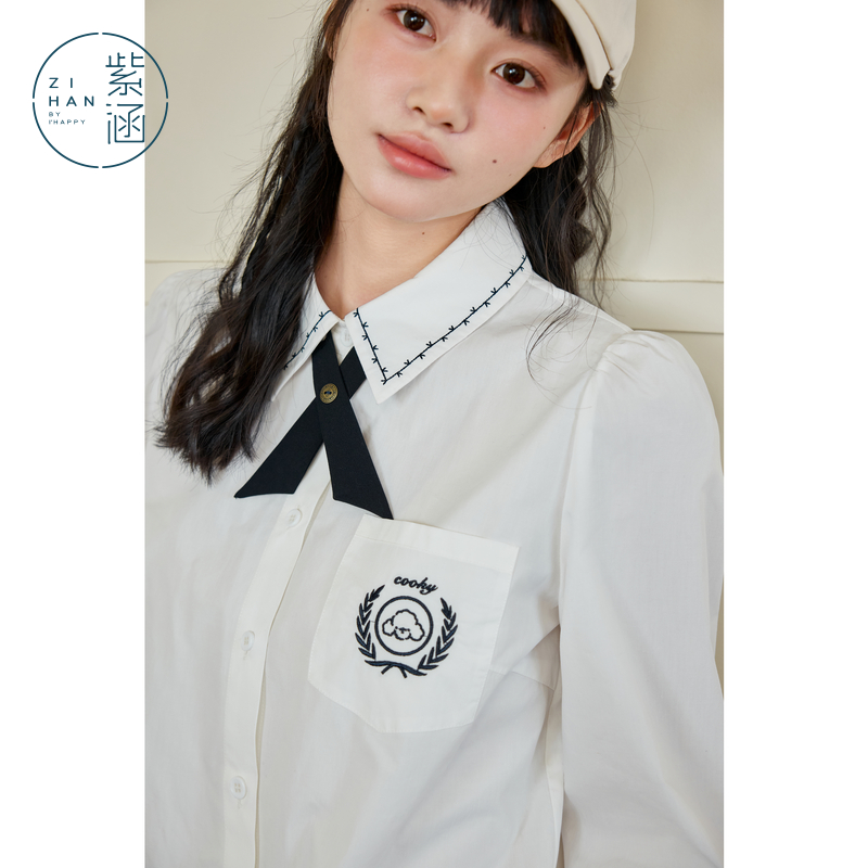 紫涵领结刺绣长袖衬衫女春秋季新款甜美学院风白色内搭翻领衬衣潮