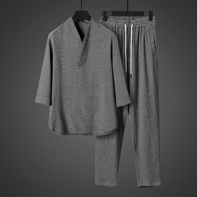 潮牌亚麻套装男士夏季短袖休闲宽松冰丝中国风运动大码棉麻两件套