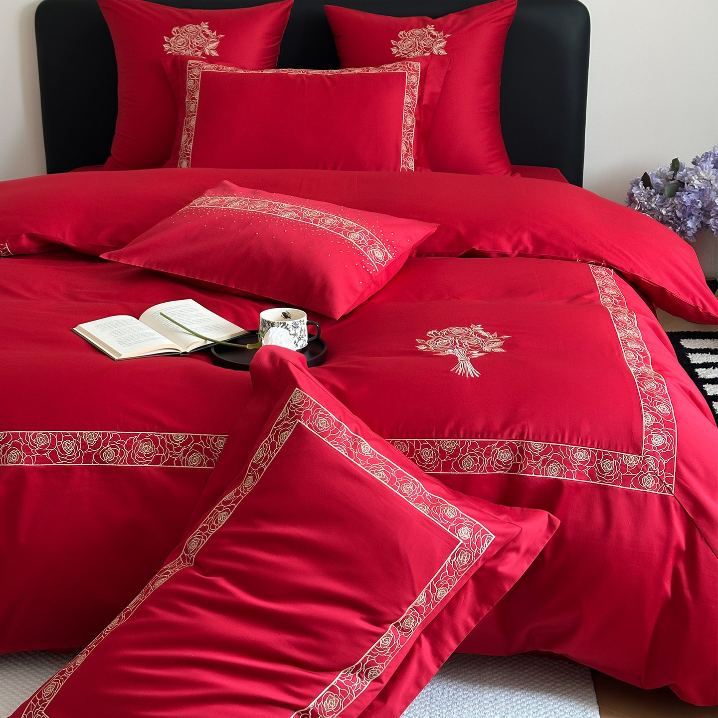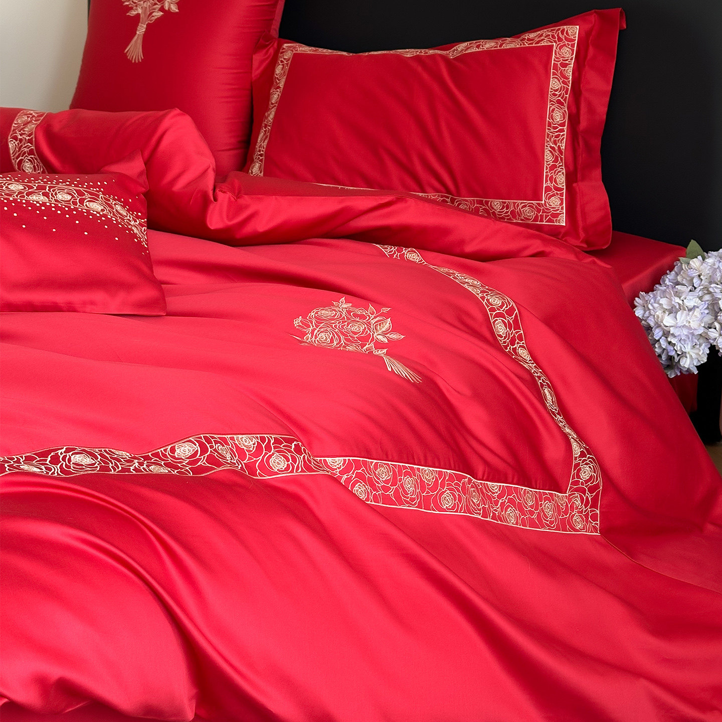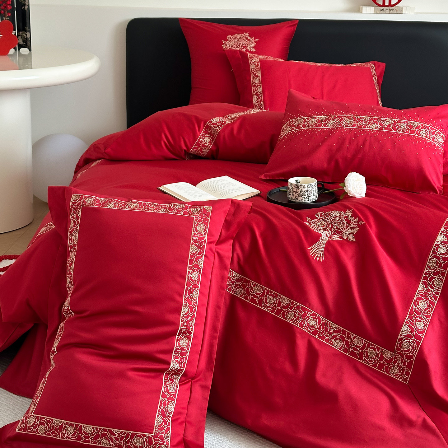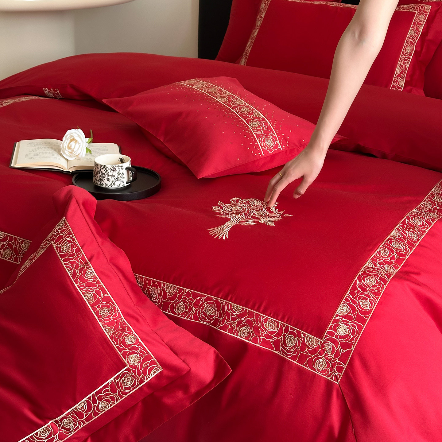 LANSWAY现代婚礼床品四件套简约刺绣全棉红色结婚被套床单1.8床笠