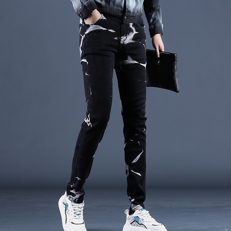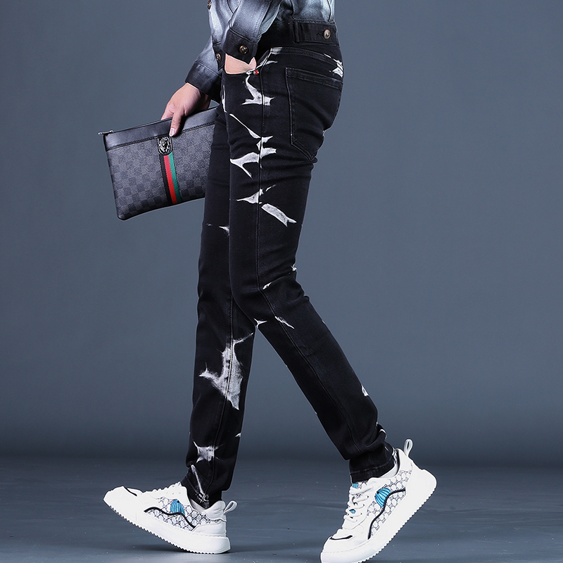 2025秋季新款高端黑色印花男士牛仔裤修身小脚弹力休闲长裤子男潮