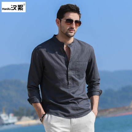 汉絮立领棉麻衬衫男士春季长袖文艺休闲上衣潮流宽松男装亚麻衬衣