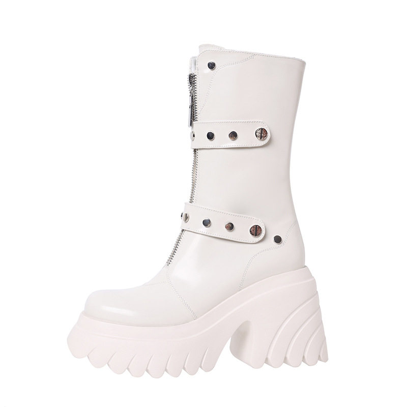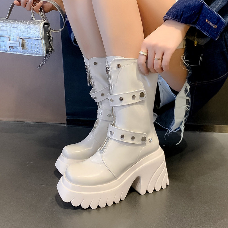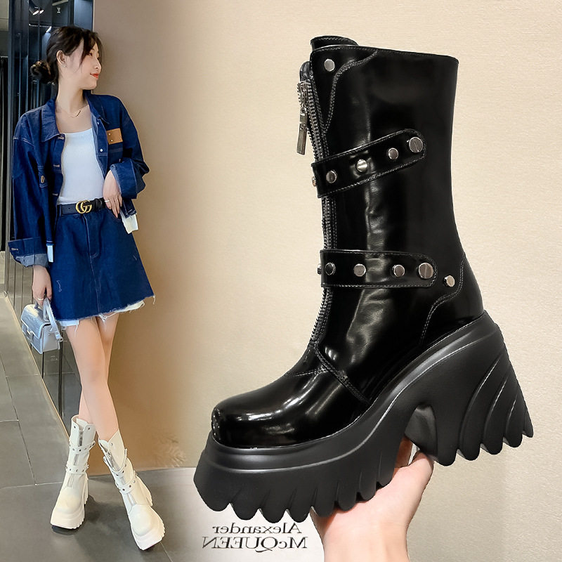 秋冬季真皮高跟10cm甜酷马丁靴圆头厚底粗跟小个子亮面漆皮中筒靴