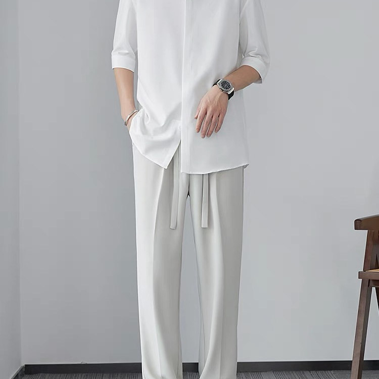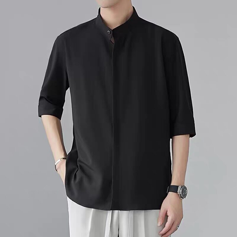 新中式立领长袖衬衫男士夏季新款纯色衬衣高级感冰丝垂感中袖衬衫