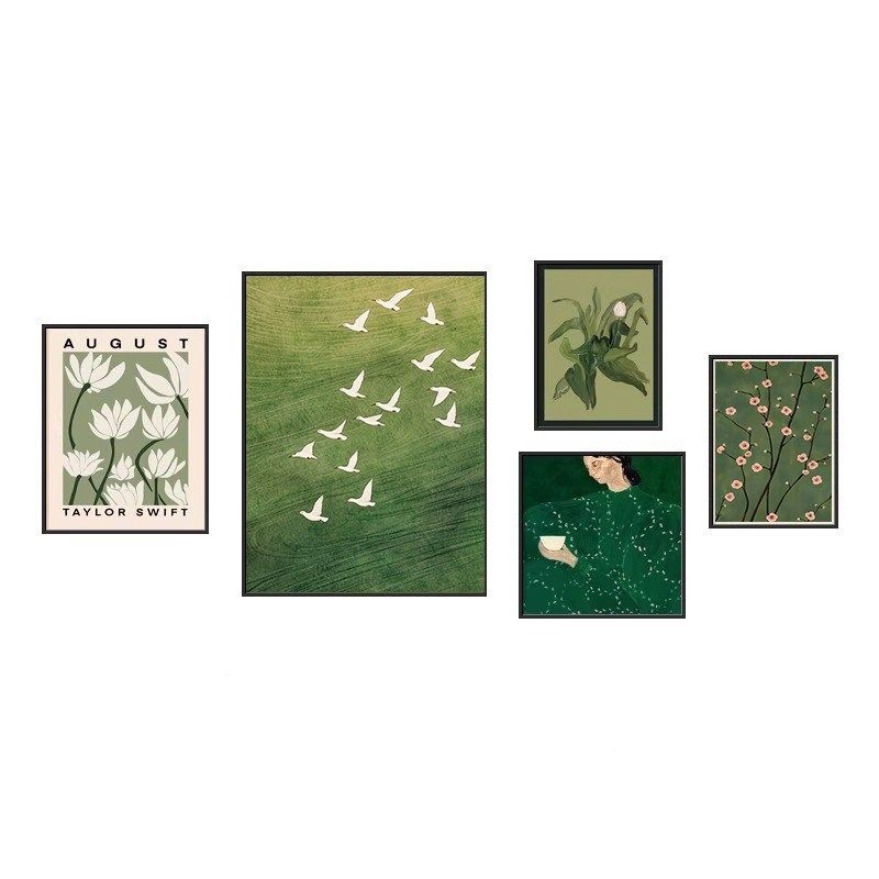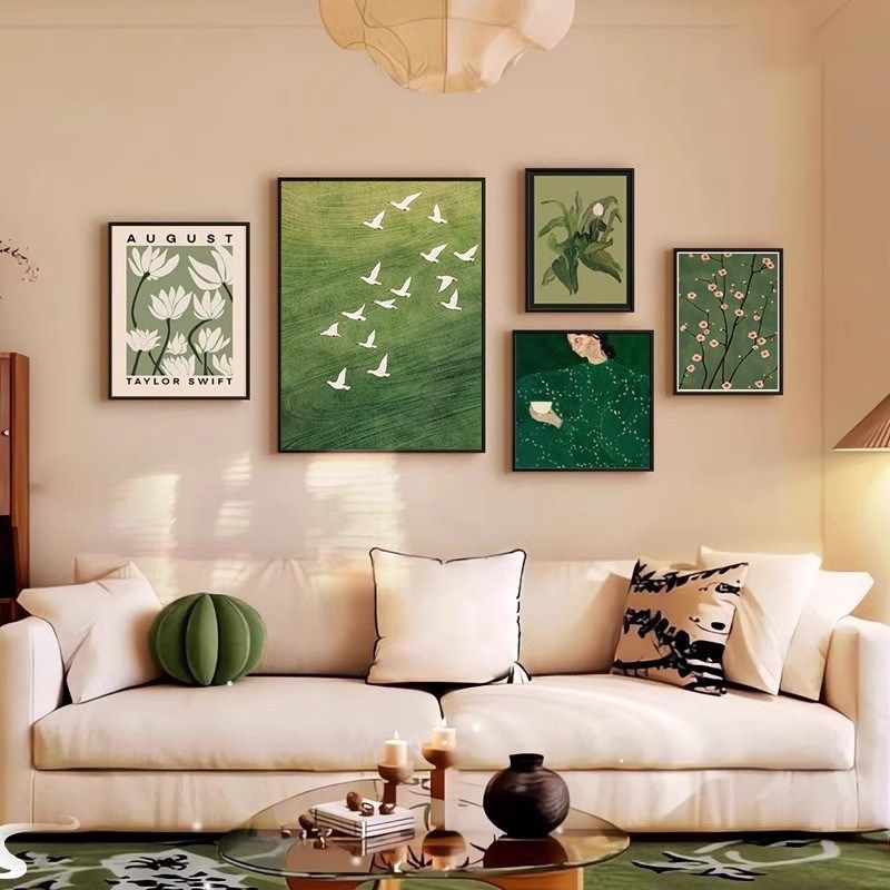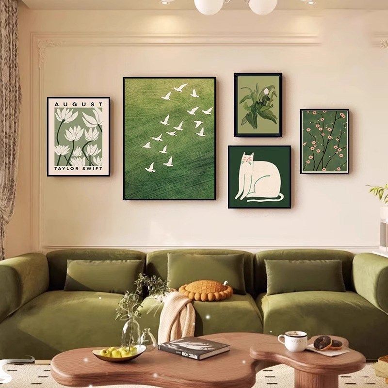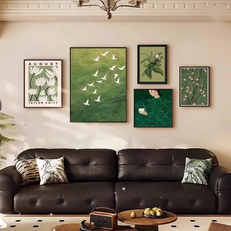法式复古客厅装饰画中古风沙发背景墙挂画高级感绿色风景组合壁画