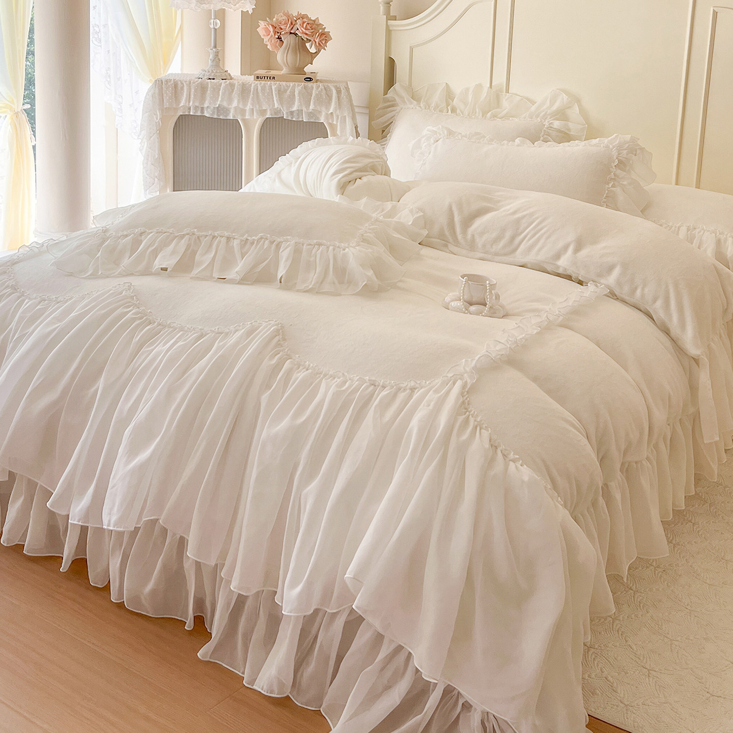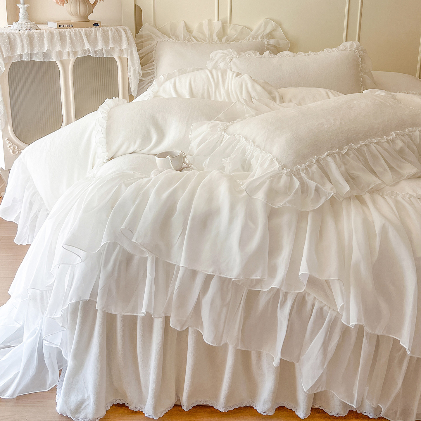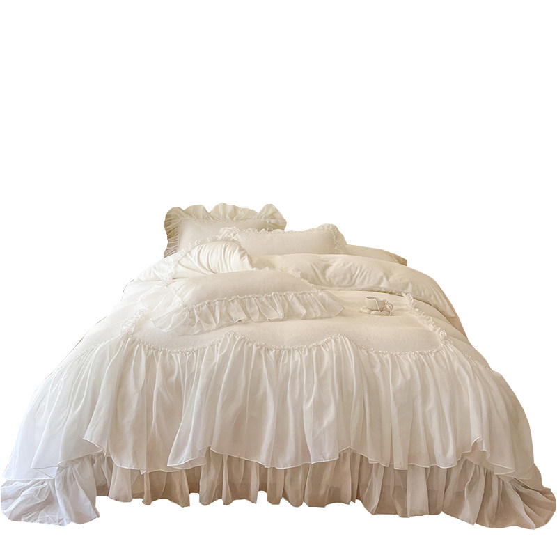 法式冬季床裙款牛奶绒四件套公主风蕾丝珊瑚绒双面绒加厚白色被套