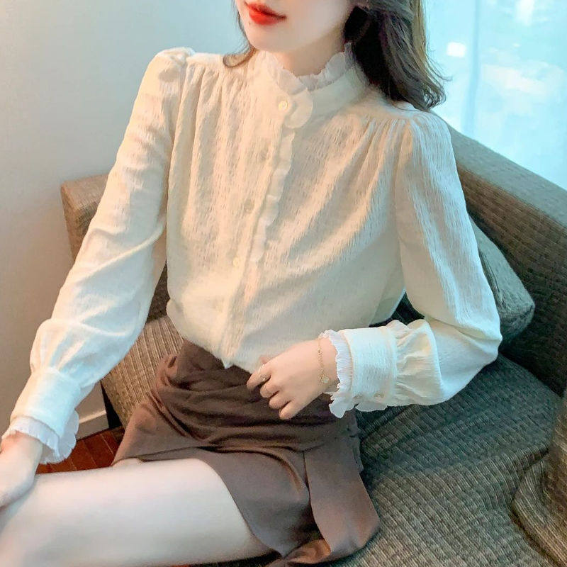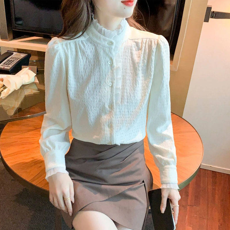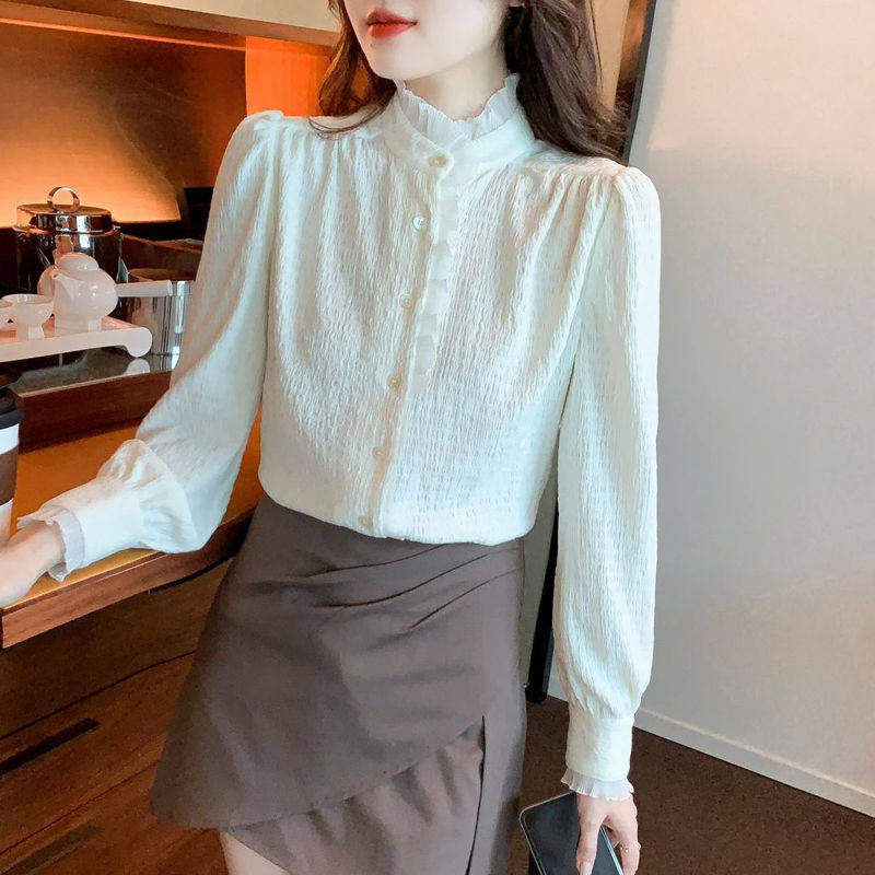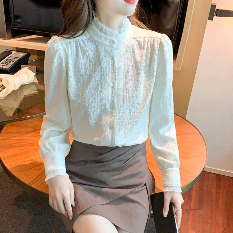 秋冬加绒加厚木耳花边立领长袖衬衫女气质时尚内搭打底洋气小衫潮