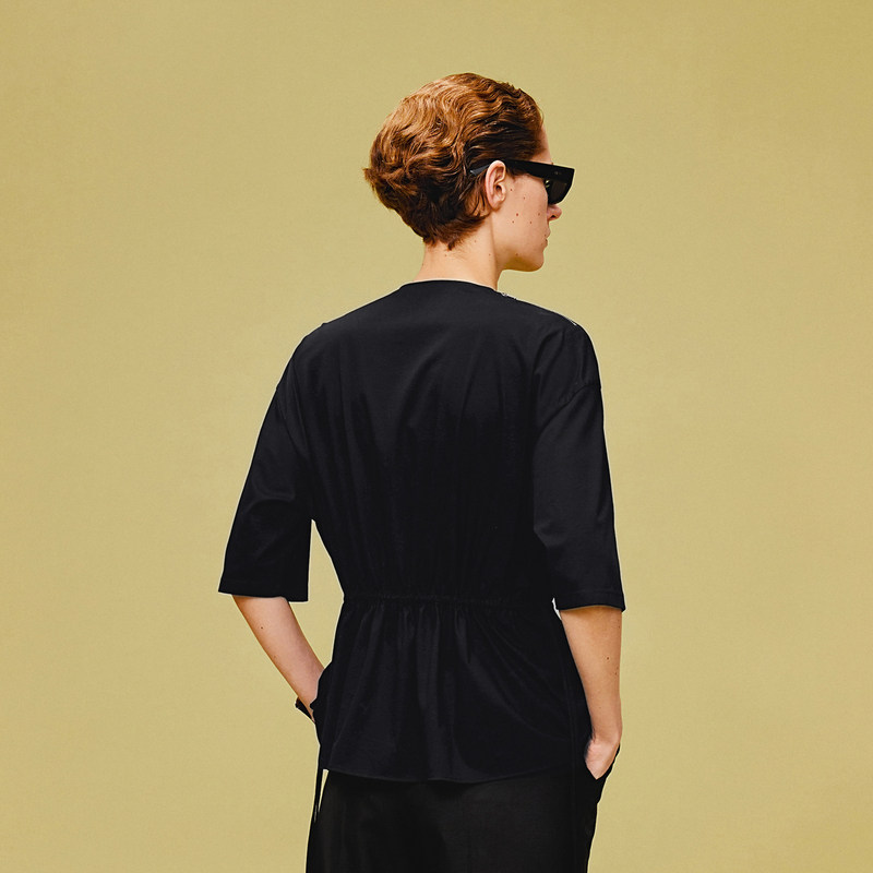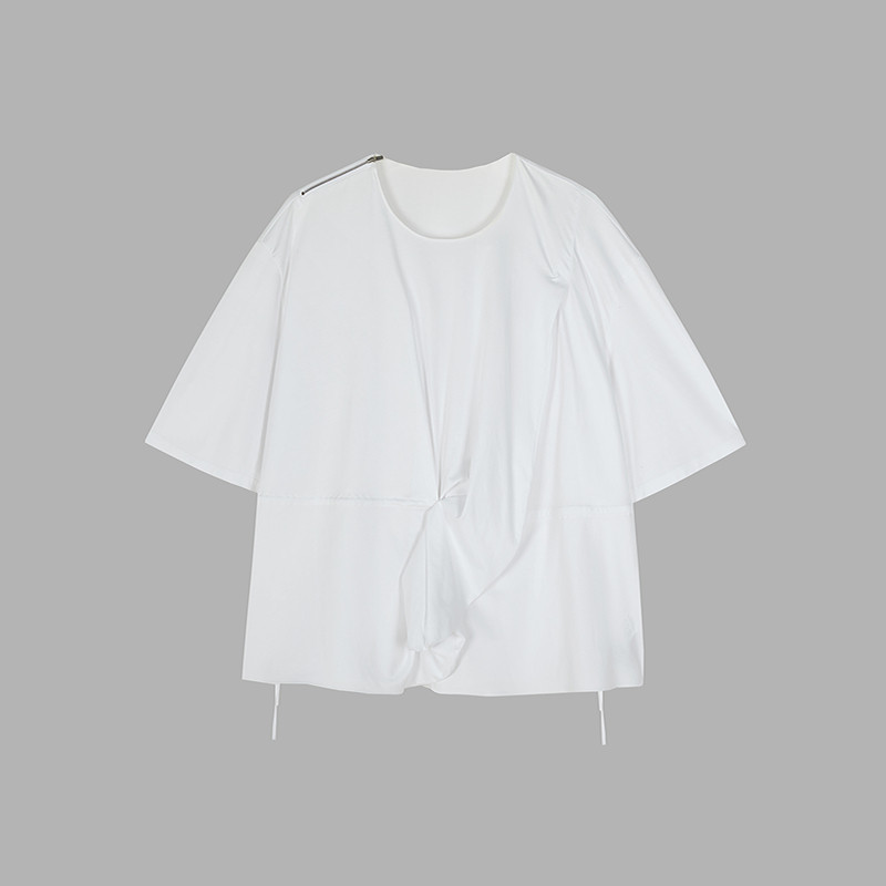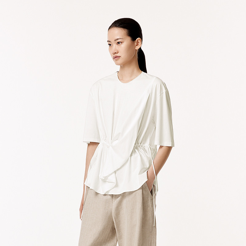 LESS夏日休闲简约抽褶圆领T恤女设计感全棉宽松短袖上衣2O5114380