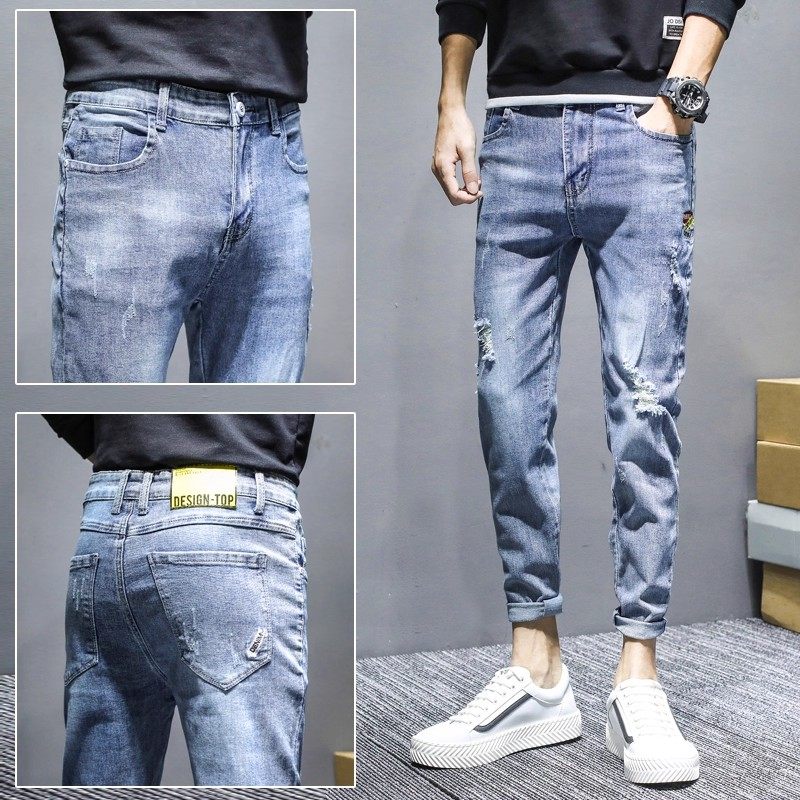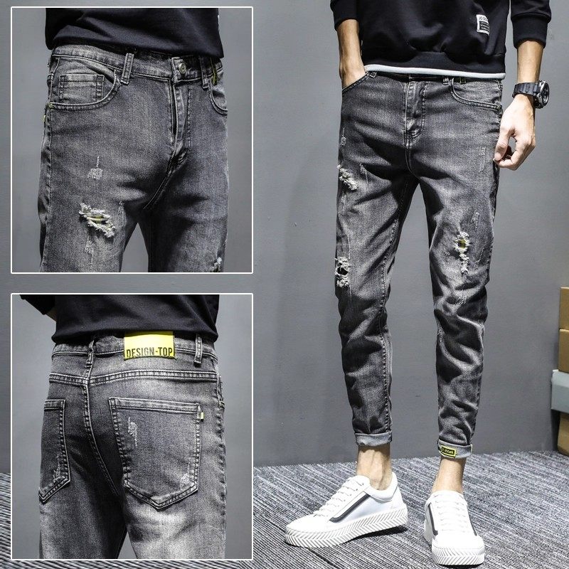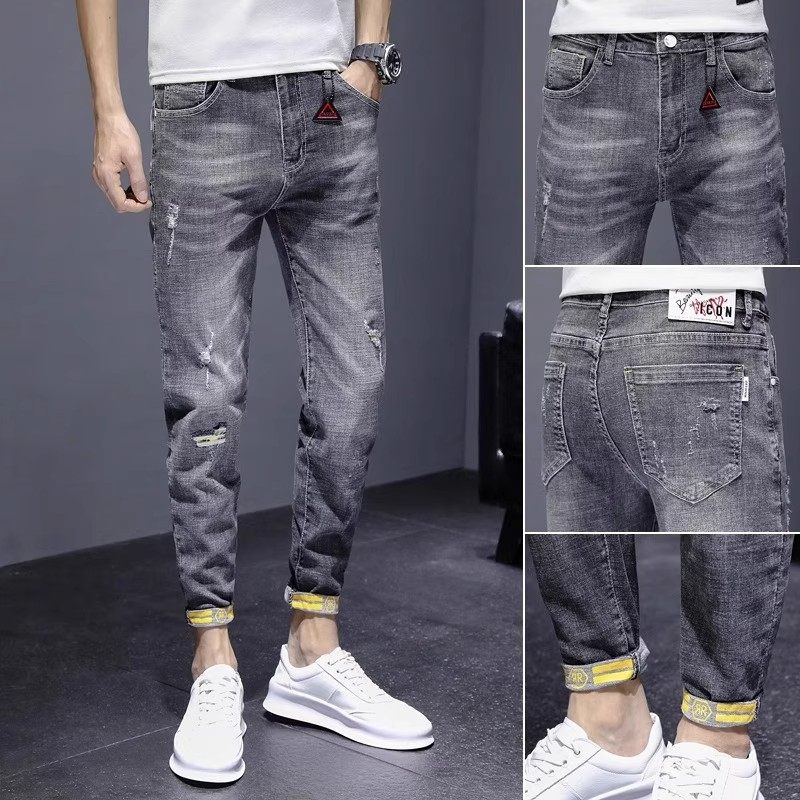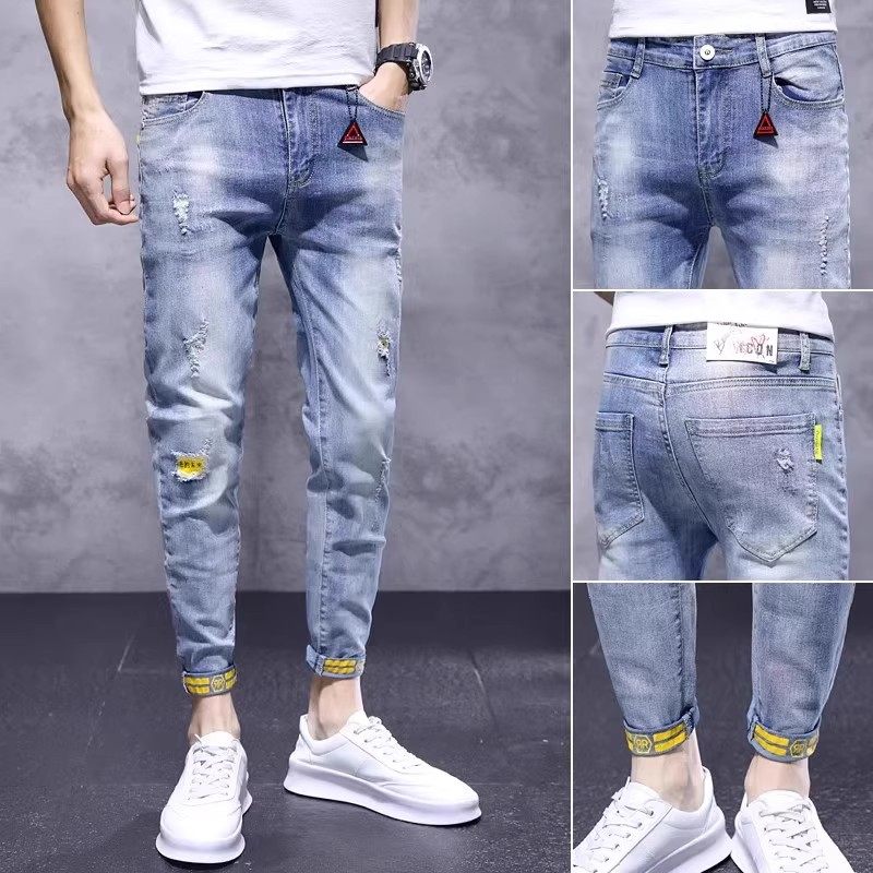 春秋新款浅色水洗破洞九分裤男士潮流韩版修身牛仔裤弹力运动裤男