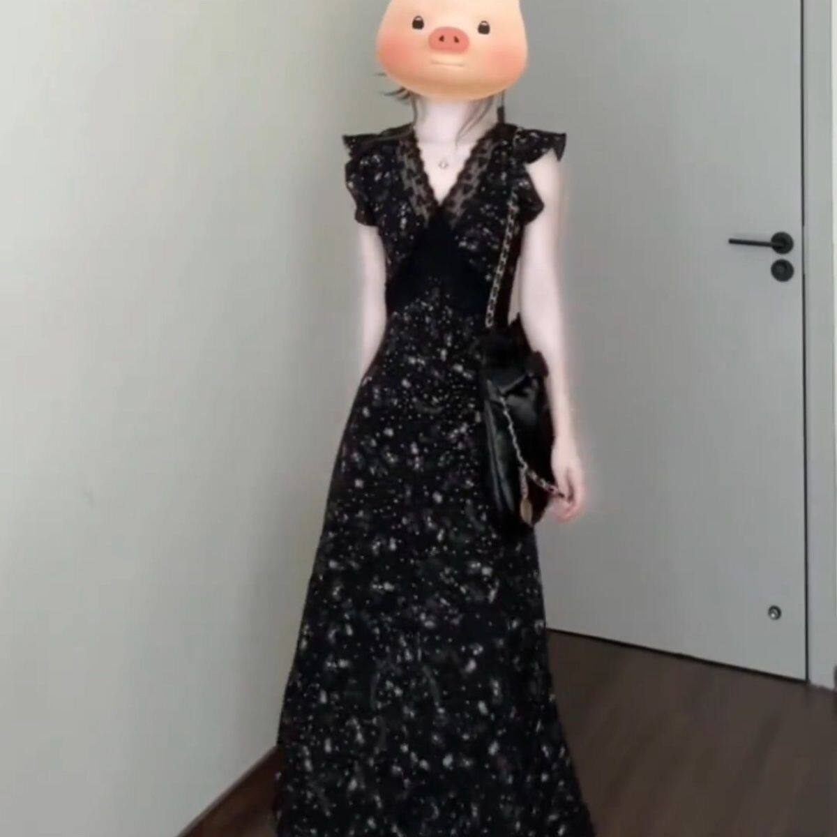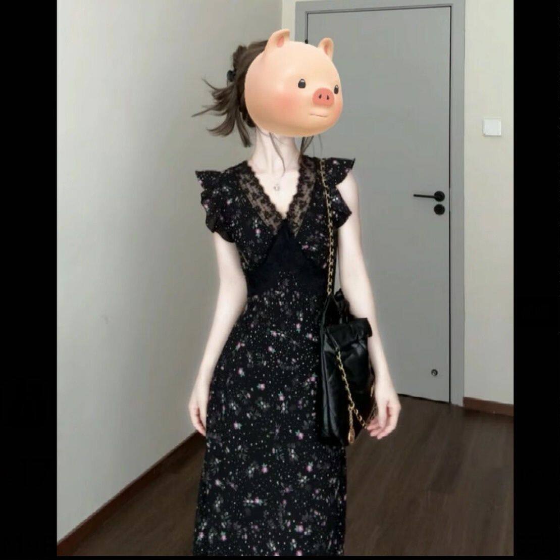 黑色蕾丝拼接碎花连衣裙夏季度假风法式气质独特漂亮斜裁掐腰长裙
