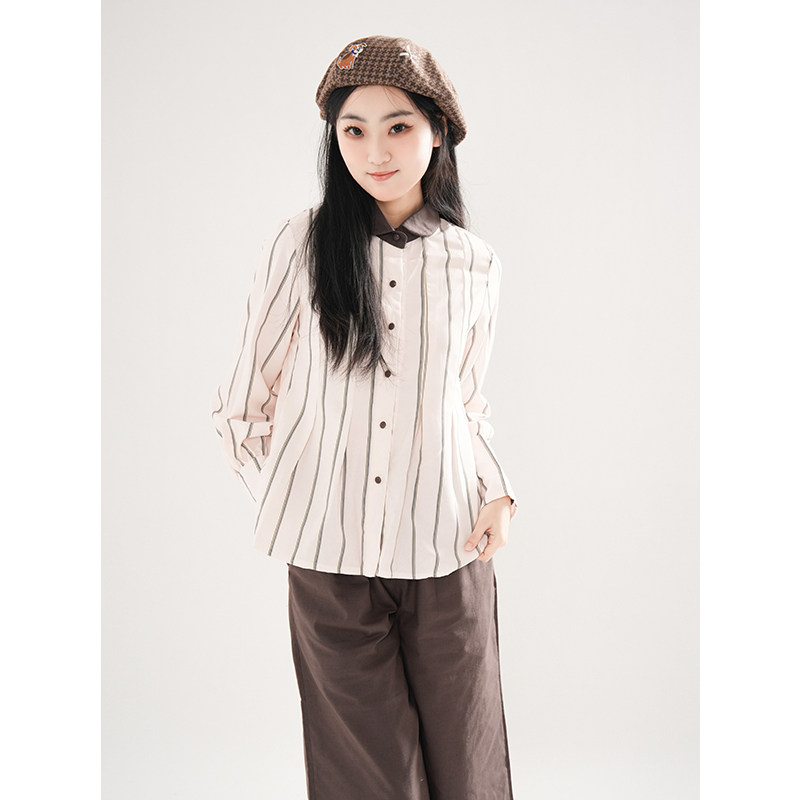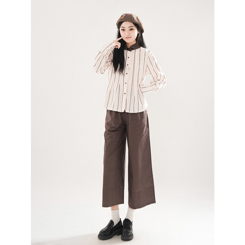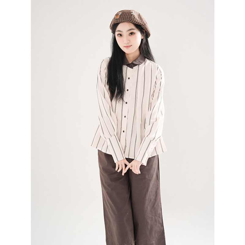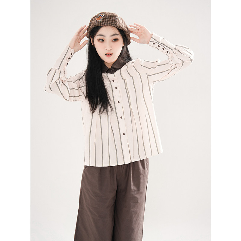 【约塔】文艺复古羊腿袖撞色条纹长袖衬衫上衣+裤子两件套装