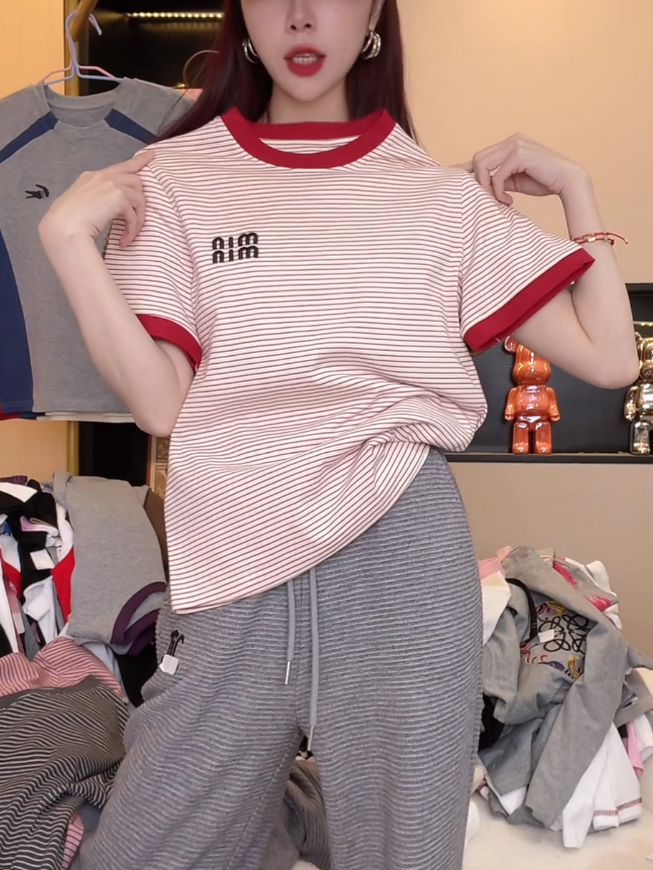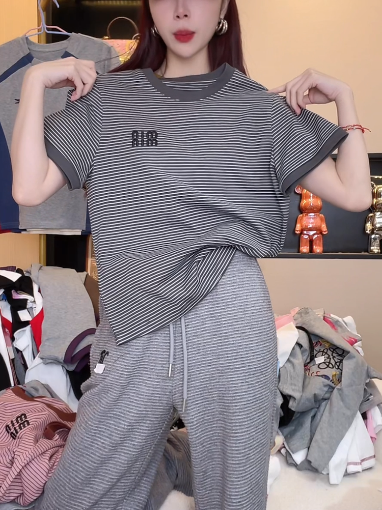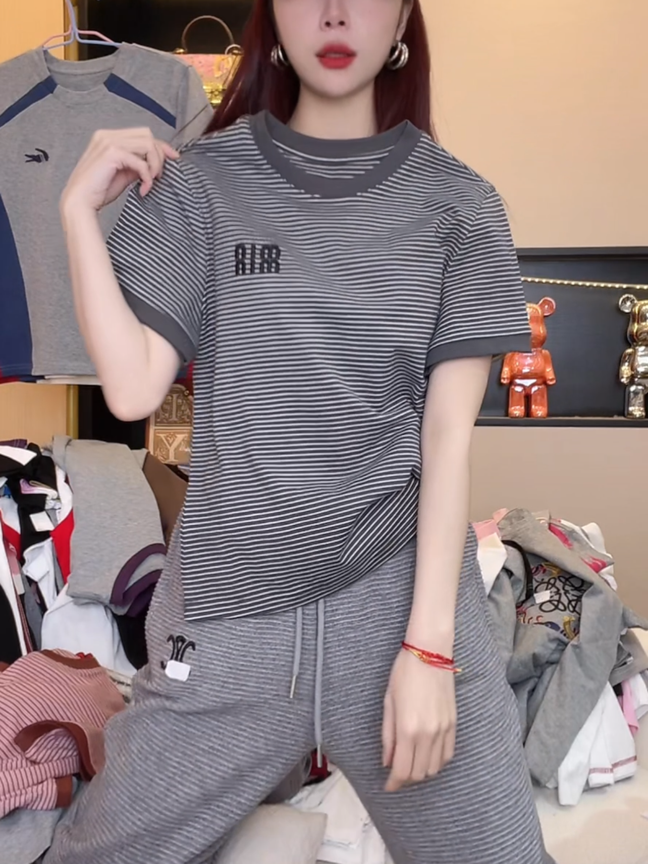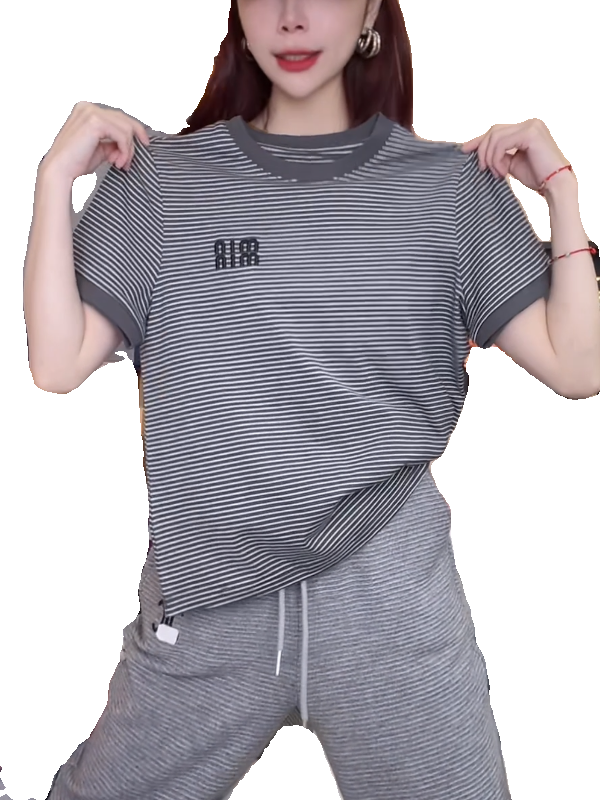 字母刺绣条纹短袖T恤女2025夏季新款潮牌时尚宽松百搭显瘦上衣潮