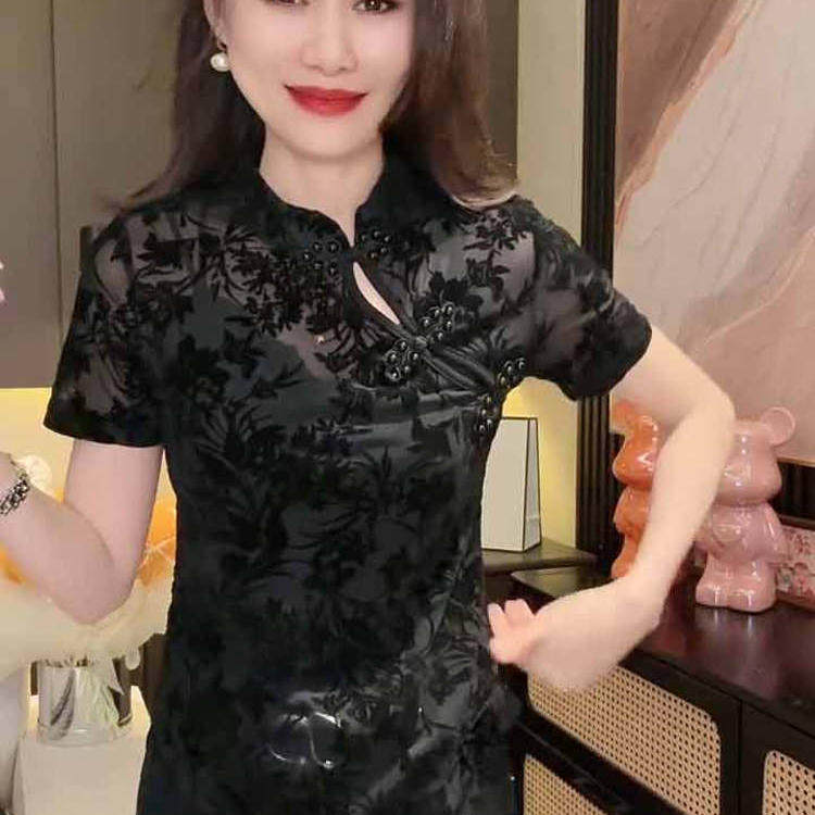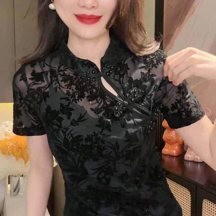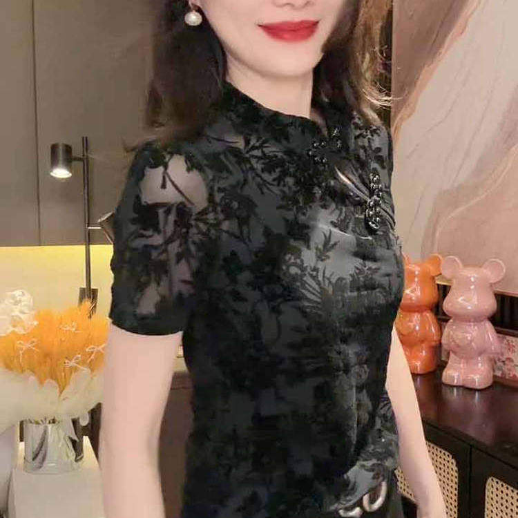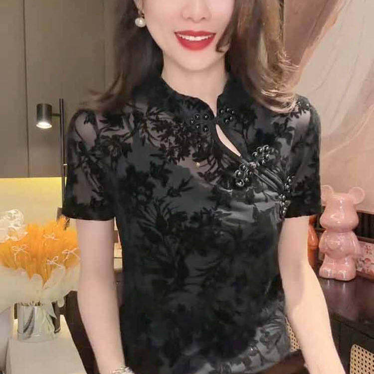 新中式复古立领盘扣短袖T恤女夏季国风修身蕾丝植绒网纱小衫上衣t