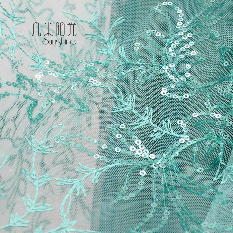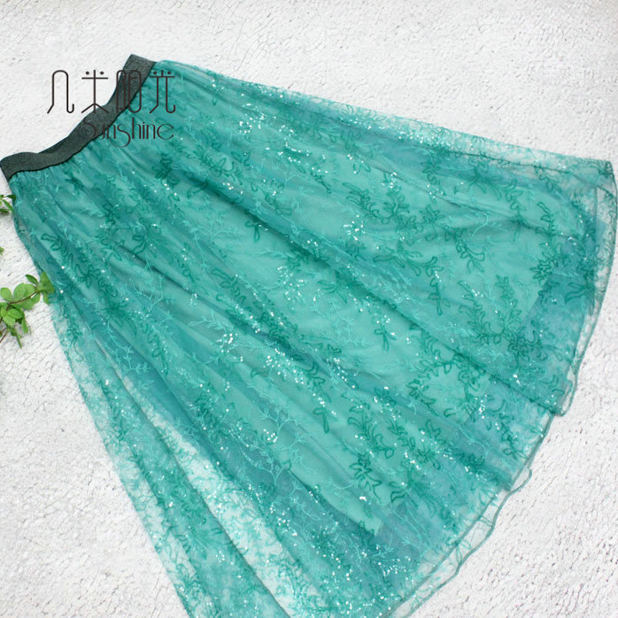 几米阳光高档复合绣花裙闪闪亮片青绿网纱裙 A字修身半身裙长裙
