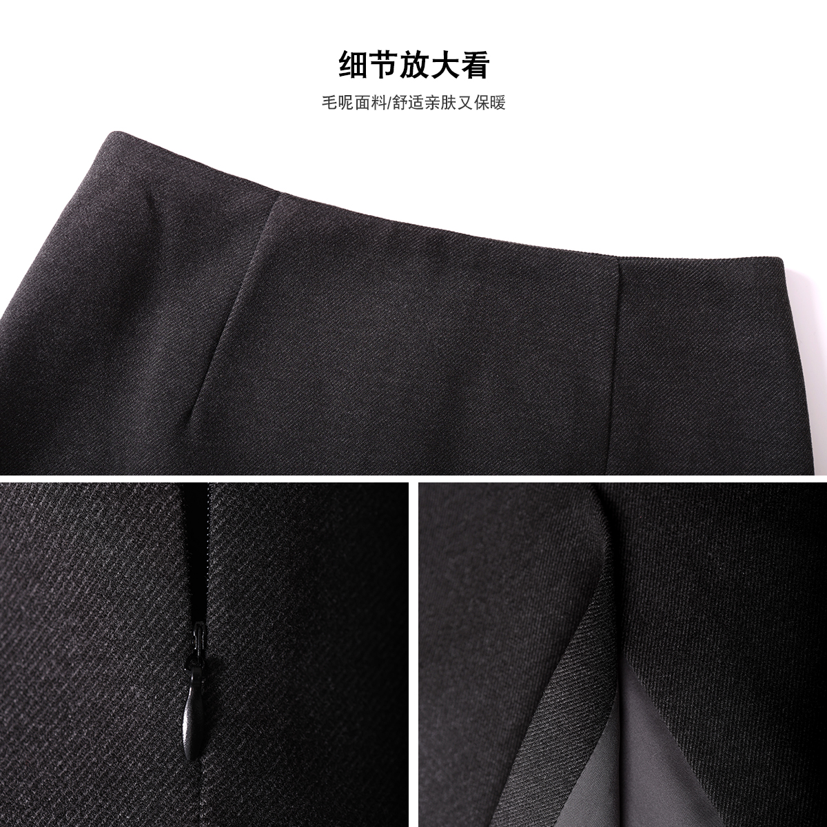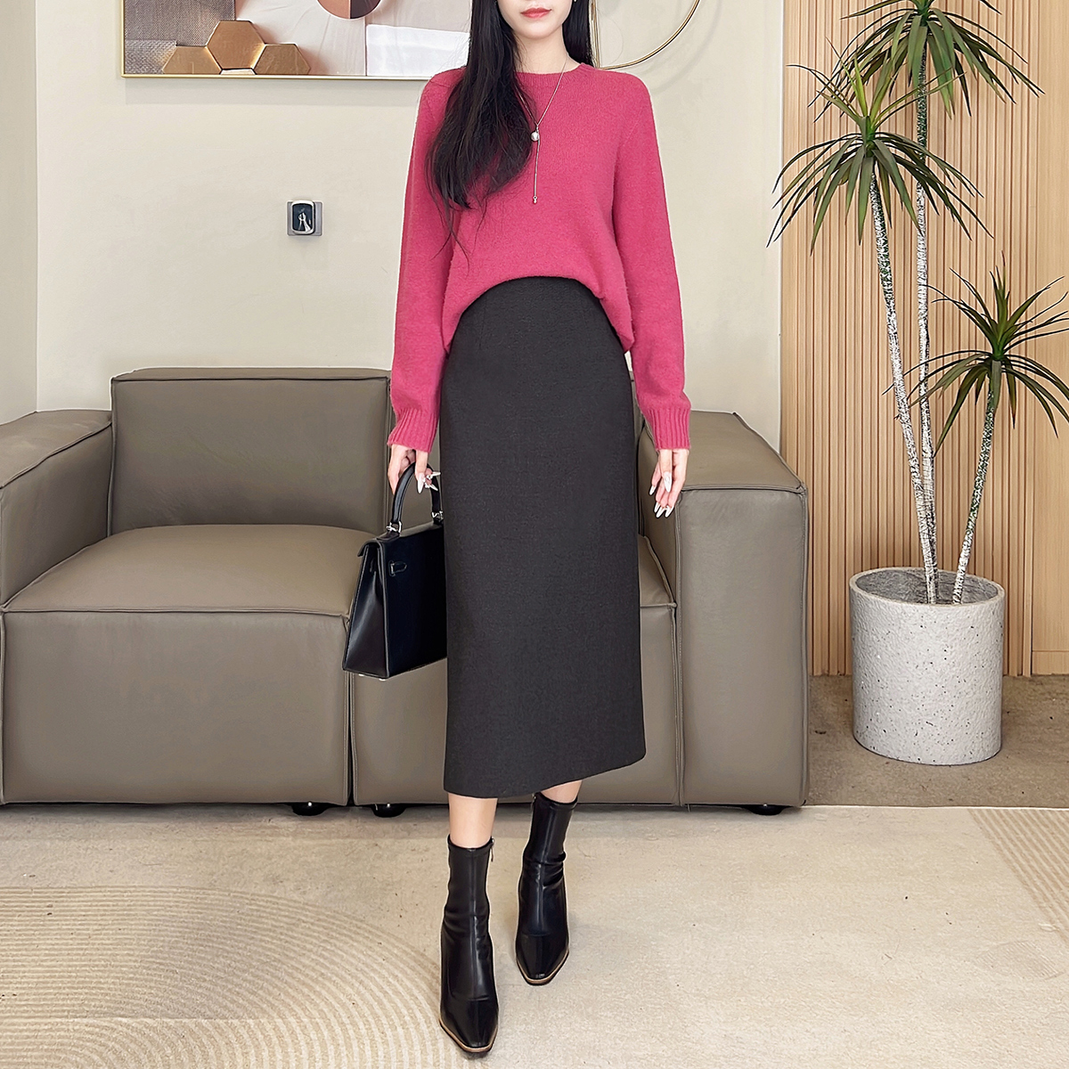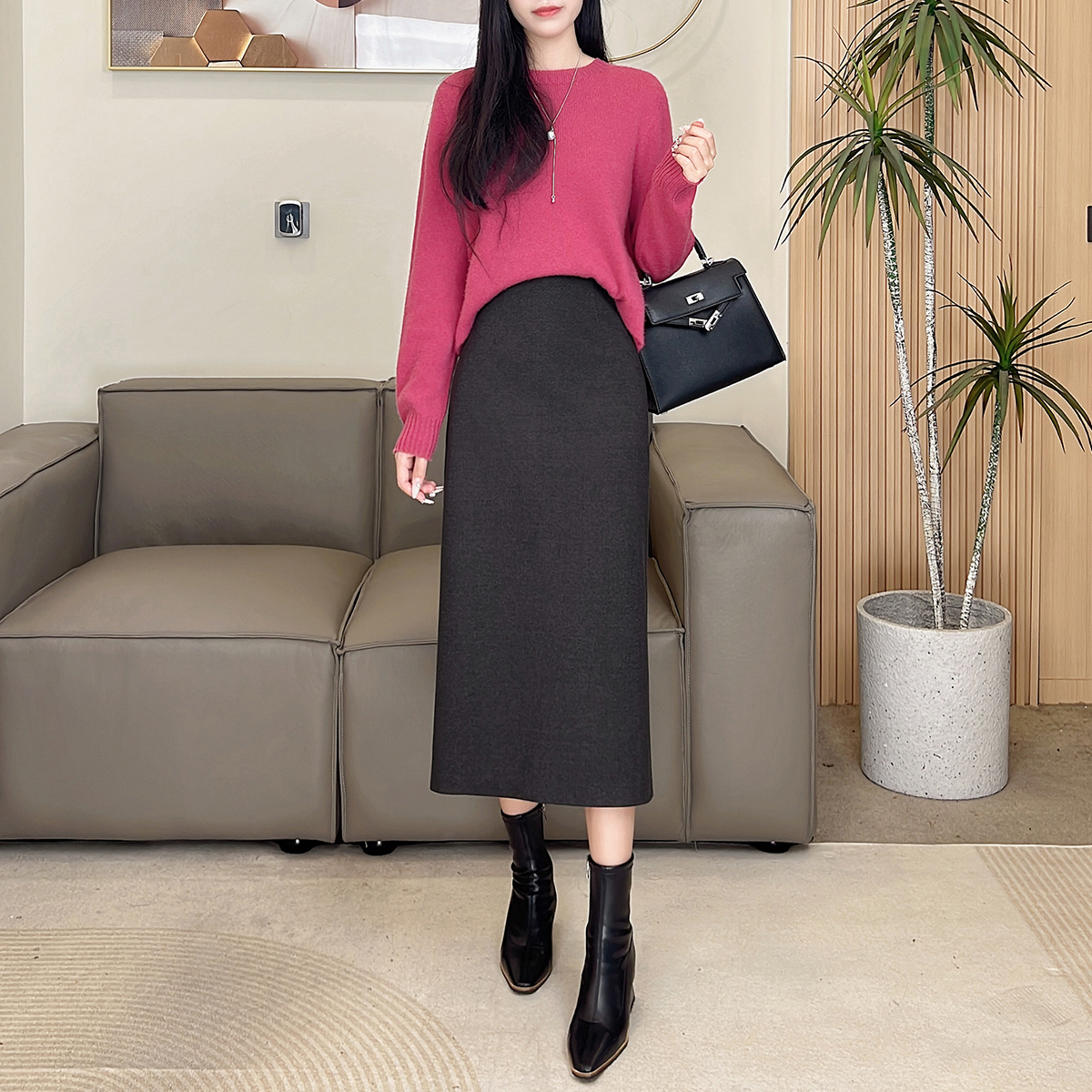 毛呢直筒半身裙女2025冬季新款高腰显瘦A字长裙后开叉气质包臀裙