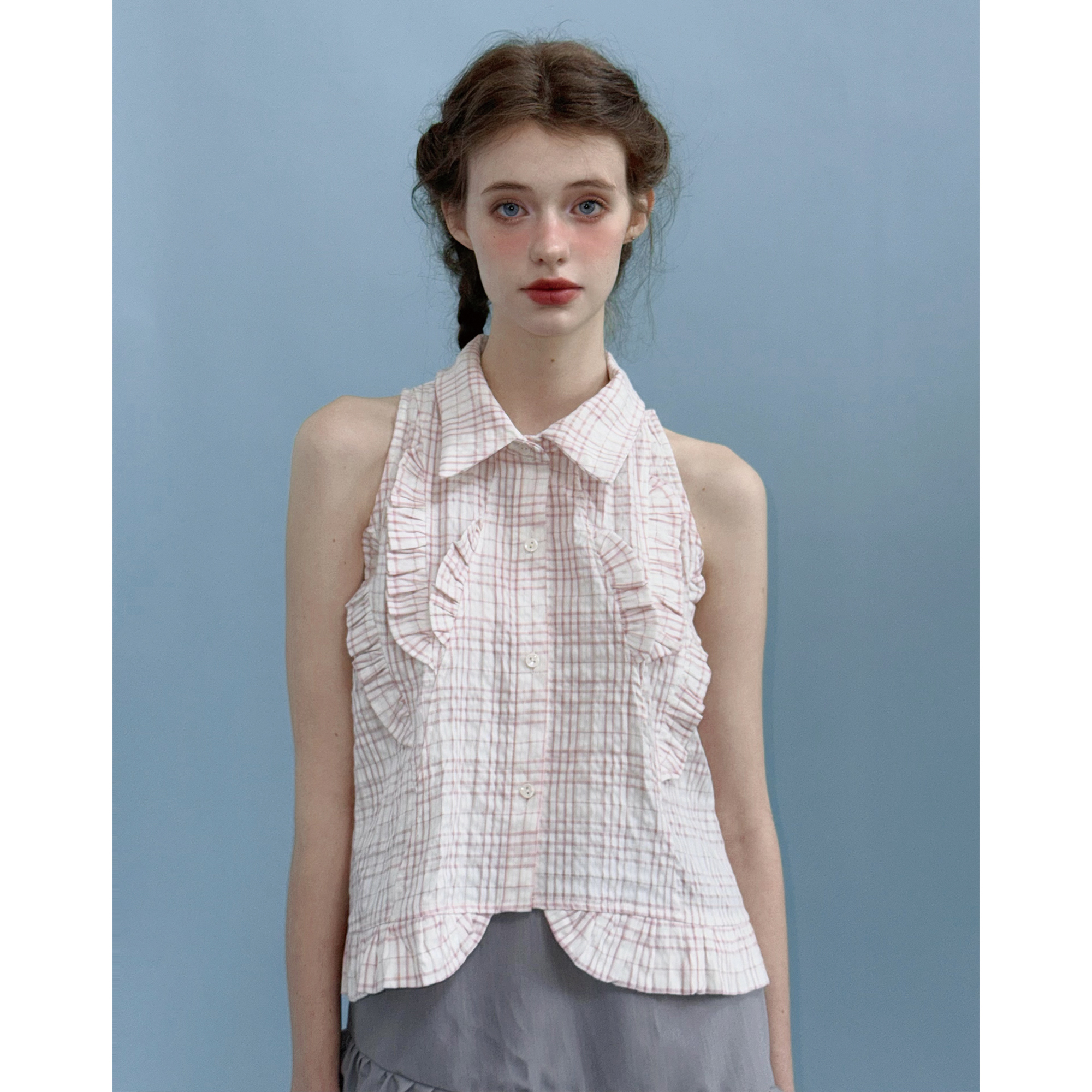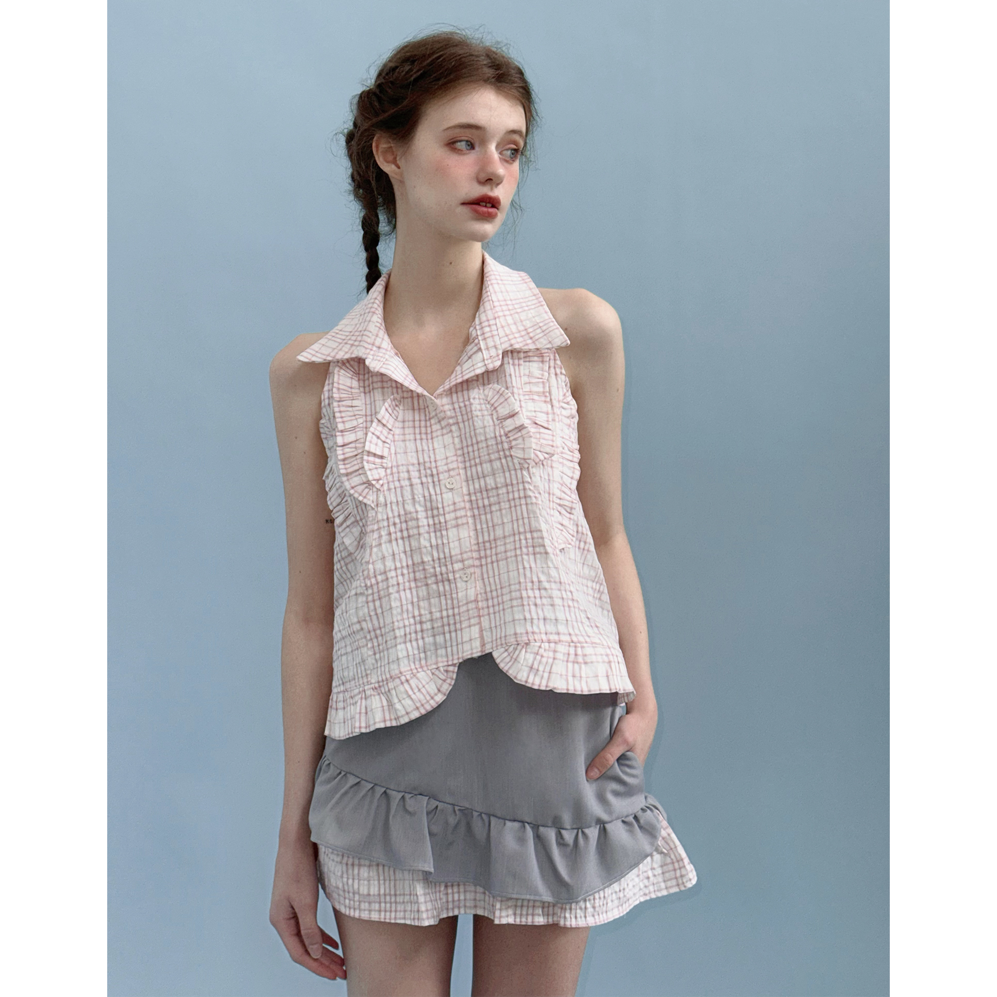俗集原创25SS-1 甜美粉色格子挂脖衬衫+半身裙套装夏季