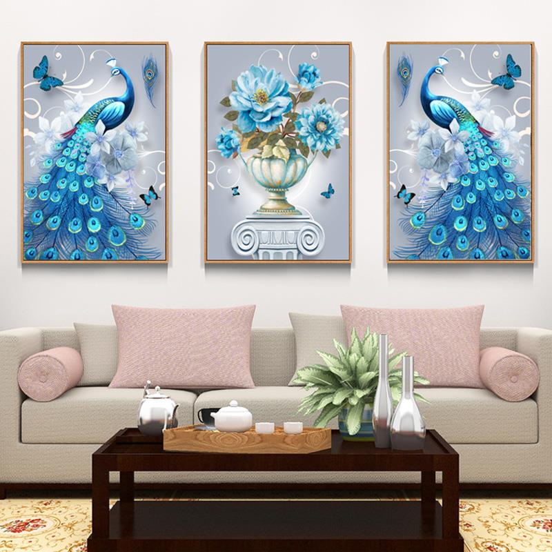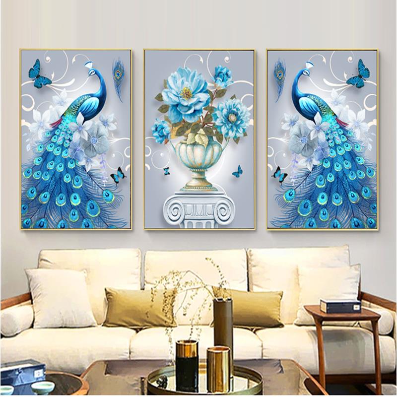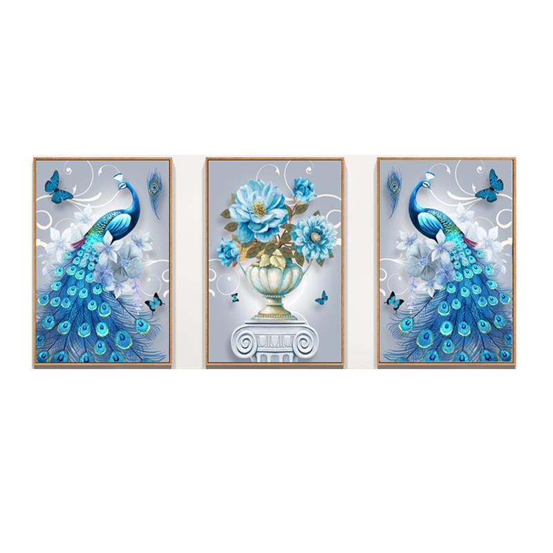 2023新款钻石画满钻客厅三联画孔雀点贴砖石十字绣钻石绣餐厅竖版