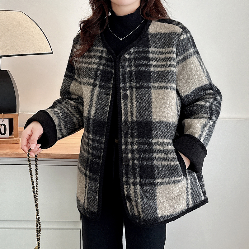 大码女装胖mm加厚黑色格纹毛呢大衣女秋冬新款高级感短款呢子外套