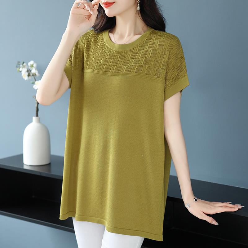 中长款桑蚕丝短袖t恤女中年妈妈夏装宽松加大码薄款冰丝针织上衣