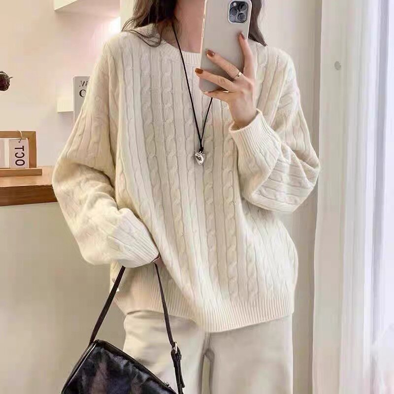 时尚慵懒风羊毛针织衫欧货百搭麻花上衣舒适套头圆领长袖羊毛衫