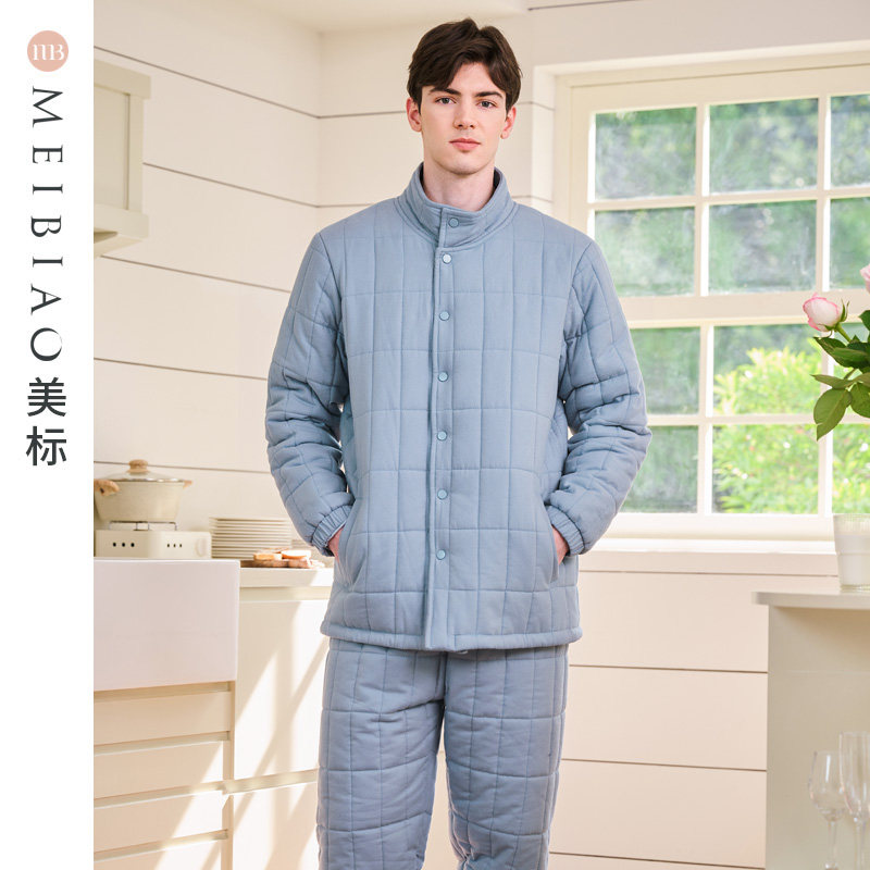 美标三层加厚夹棉纯棉睡衣套装男士秋冬全棉休闲高领可外穿家居服