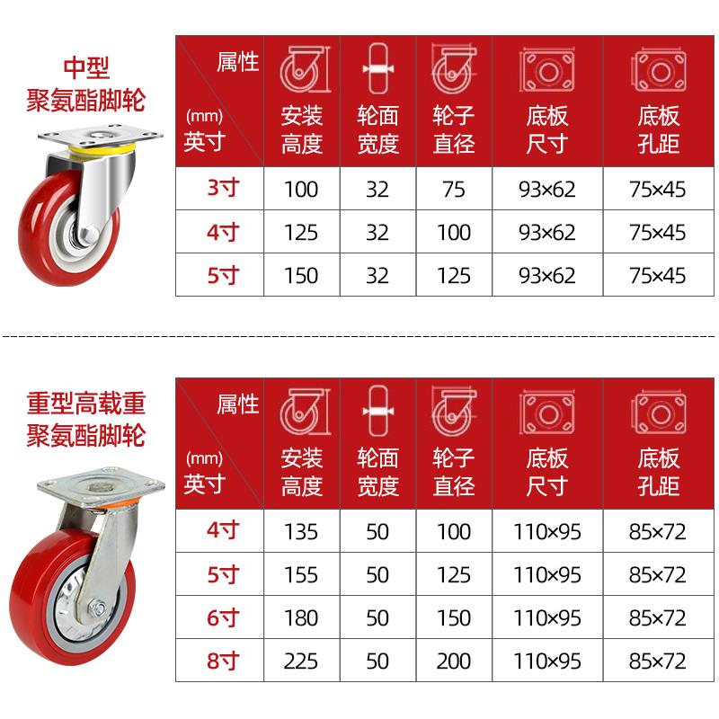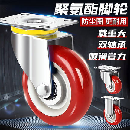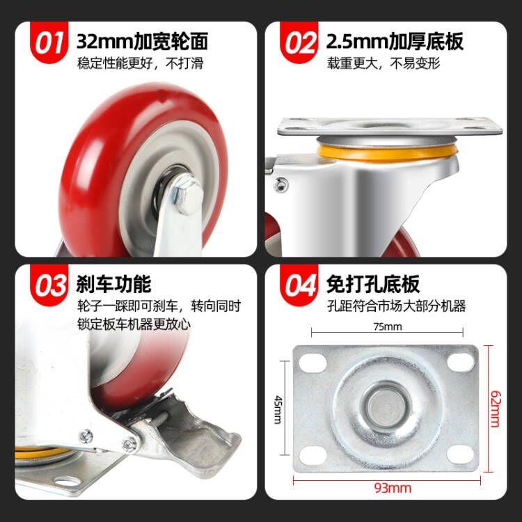 万向轮3寸5寸聚氨酯重型脚轮拖车平板车轮子板车小推车带刹车滑轮