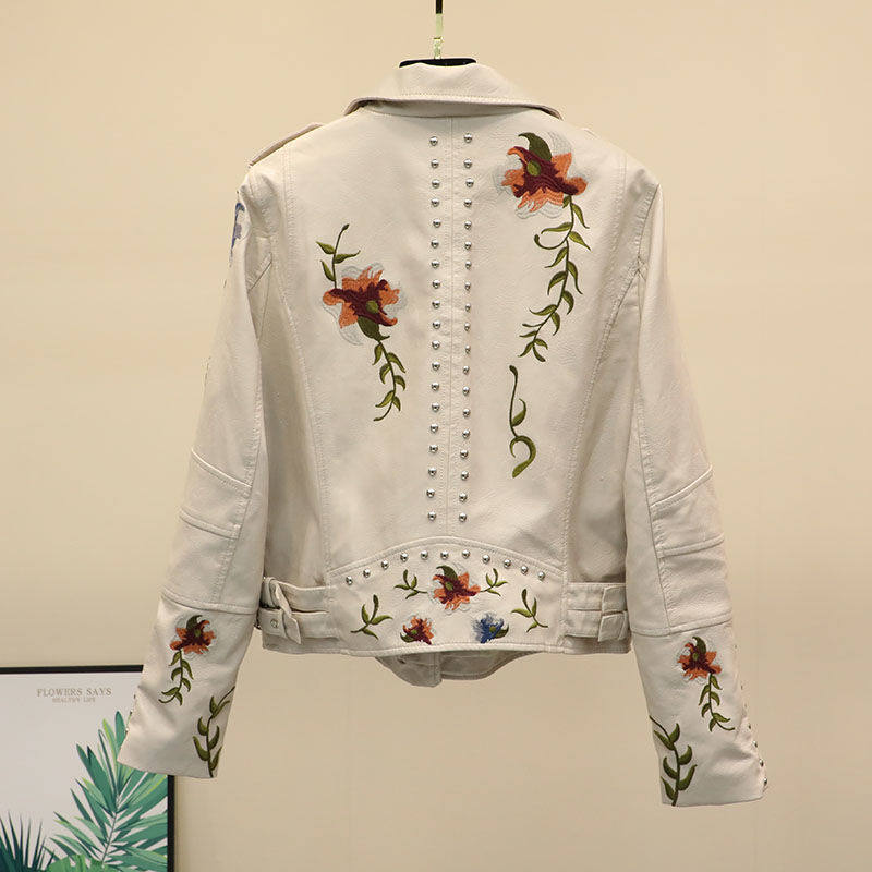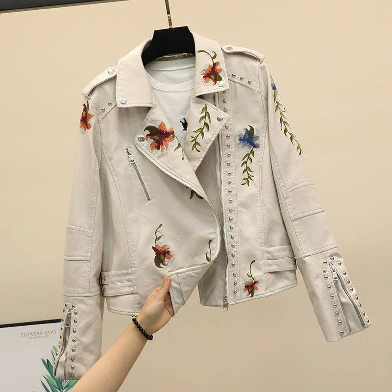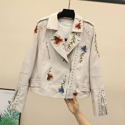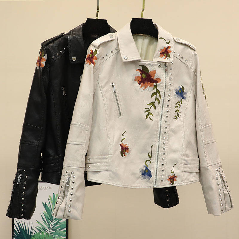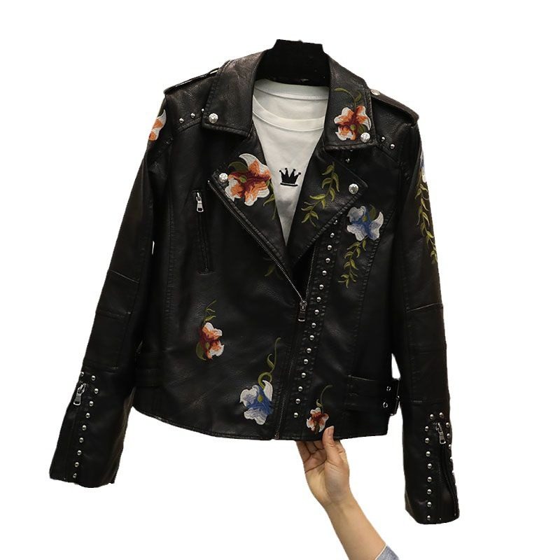 春季新款韩版修身百搭黑色铆钉刺绣水洗机车长袖皮衣女短款PU外套