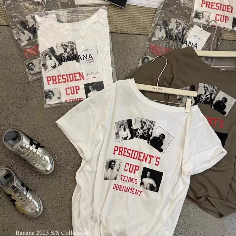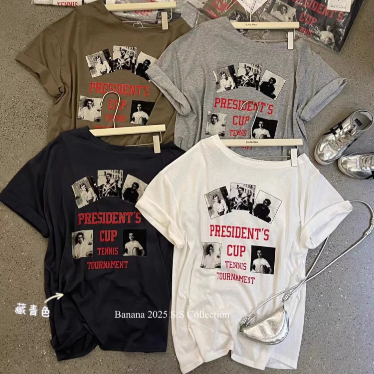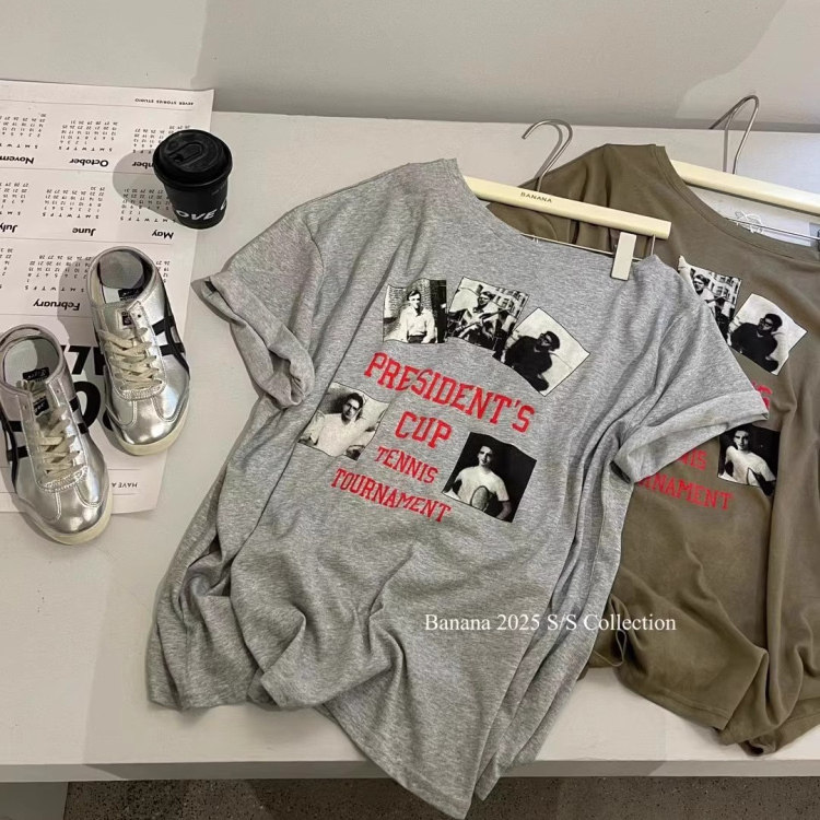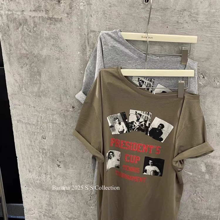 韩国东大门夏季新款美式复古印花斜肩短袖T恤女宽松时髦露肩上衣