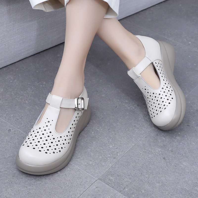 真皮厚底松糕鞋女夏玛丽珍小皮鞋乐福单鞋软底镂空妈妈鞋洞洞凉鞋