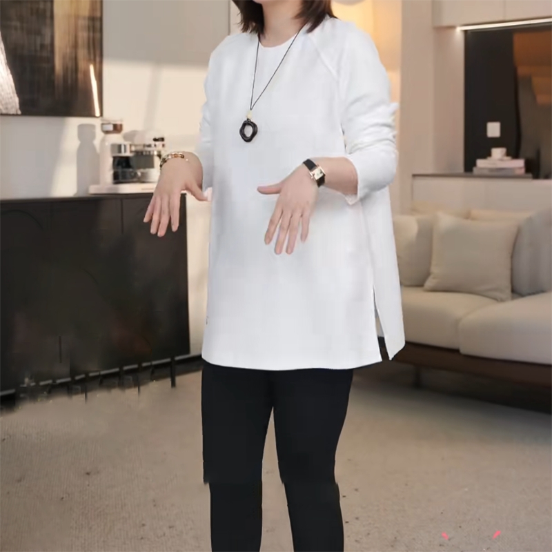 白色圆领时尚宽松长袖T恤女秋季新款大码胖mm显瘦遮肉侧开叉上衣
