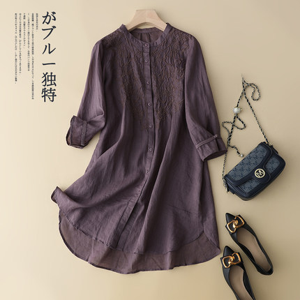 高端苎麻刺绣立领衬衫女夏季宽松大码中长款显瘦百搭薄款中袖上衣