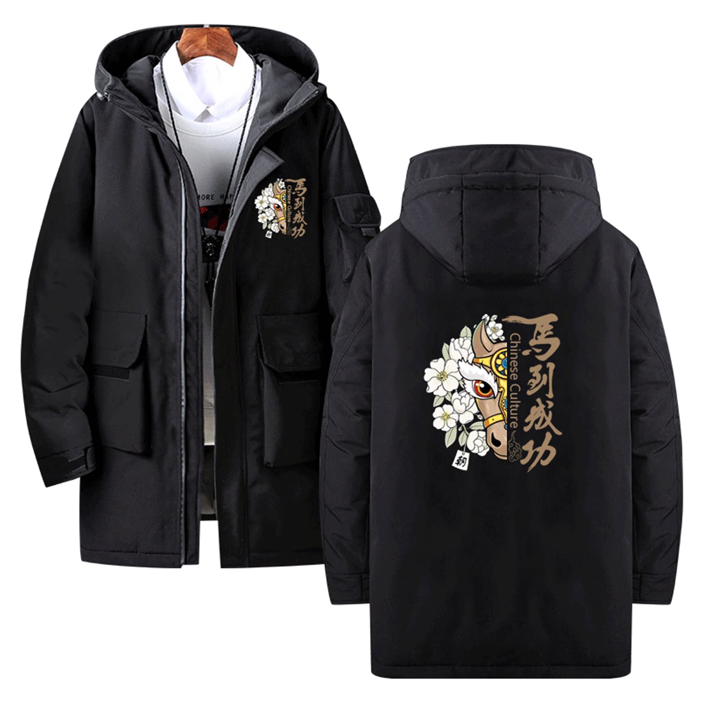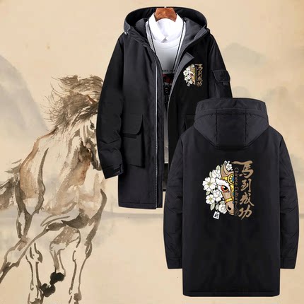 2026新年喜庆一家三口马年卡通印花可爱男女定制外套中长款羽绒服